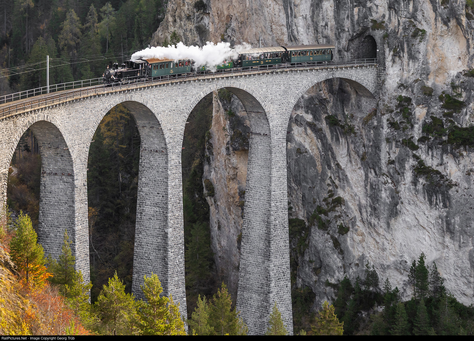 | Albula valley steamtrain 2126 from Samedan to Surava with lightoil fired G 3/4 # 11 "Heidi" is crossing the 65 meter high Landwasser viaduct and will soon make a short stop at the new Schmitten GR Landwasserviadukt stop. |