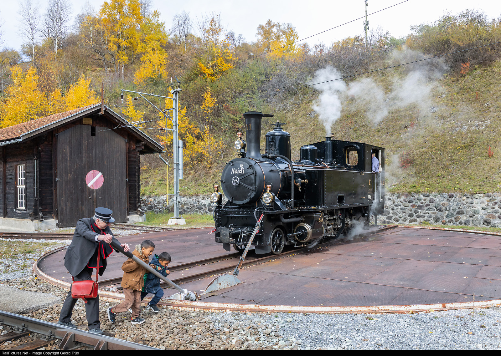 Train conductor Luzi Oberer engaged two young train enthusiasts for help to turn the steamlocomotive G 3/4 # 11 "Heidi" on the manualy operated turntable at Filisur.