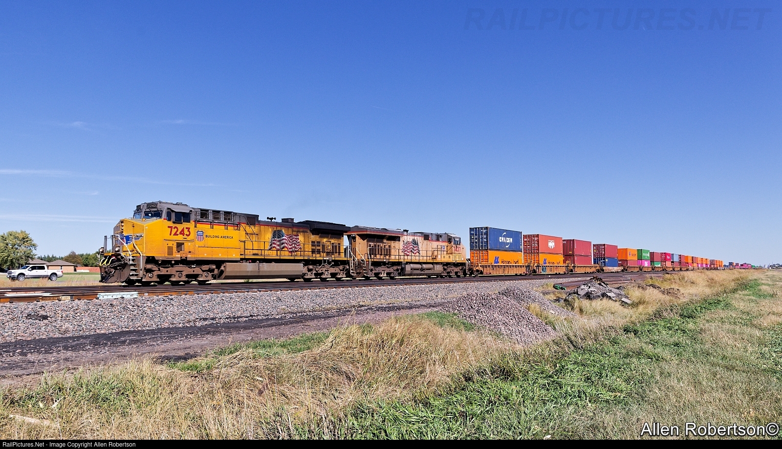 UP 7243 & 7437 power a westbound stack train.