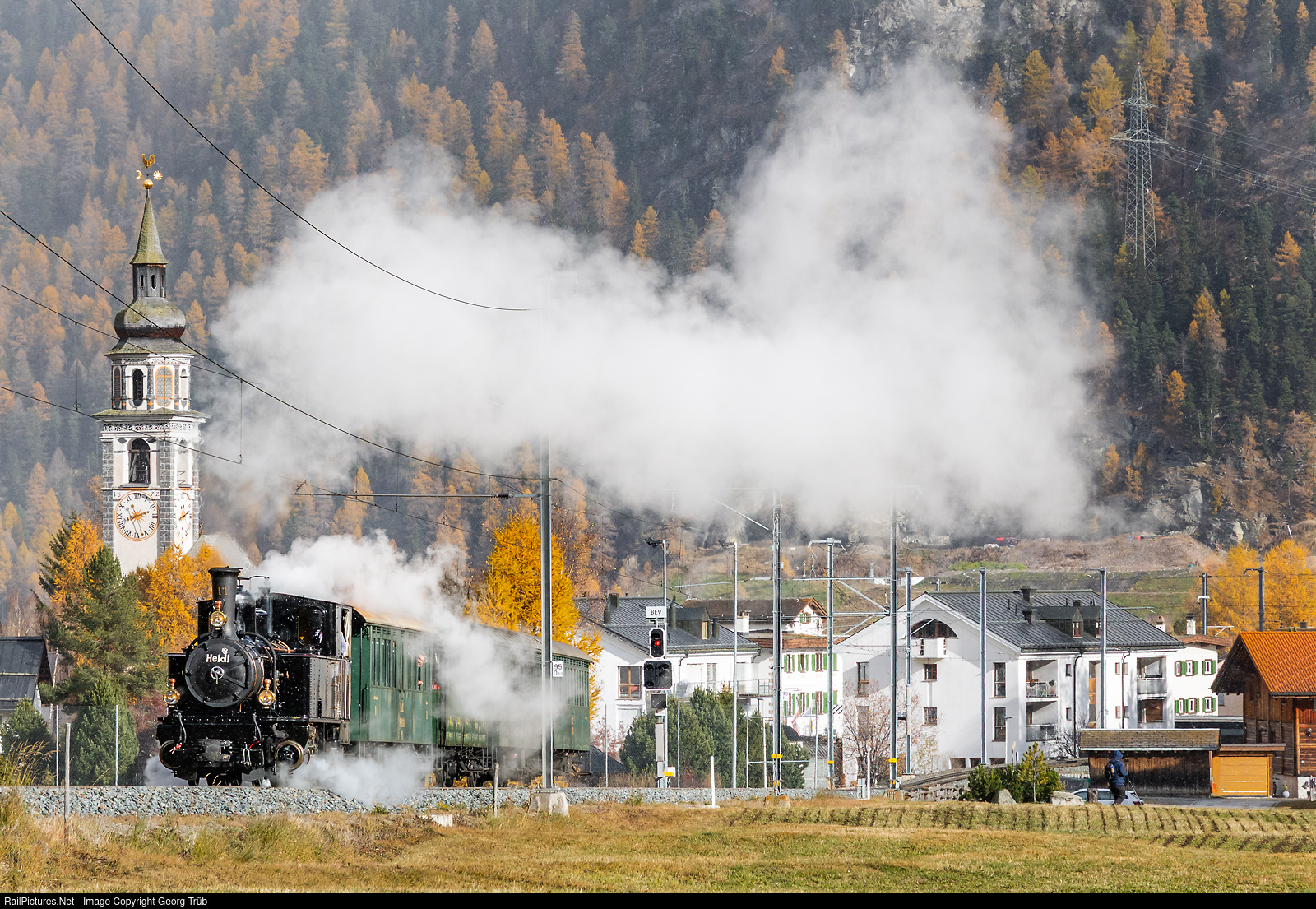 | On this day, the traditional “triangle trips” took place in the Upper Engadine. Steam locomotive G 3/4 # 11 “Heidi” of 1902 pulls its train 92148 from Pontresina via Samedan to Spinas and has just left Bever. The track climbs at a gradient of up to 3.5% towards the Albula Tunnel. The Reformed church dates from the 17th century. |
