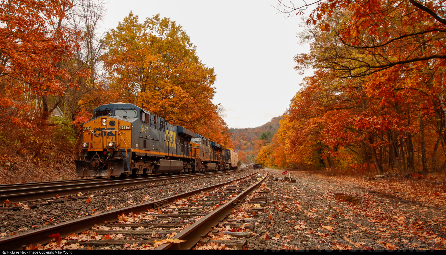 | Peak foliage all around in the Berkshire Mountain's on this early October friday morning, CSX manifest M439 fights the grade up to the summit with 3 GE's pulling around 90 cars from Worcester bound for Selkirk Yard. |