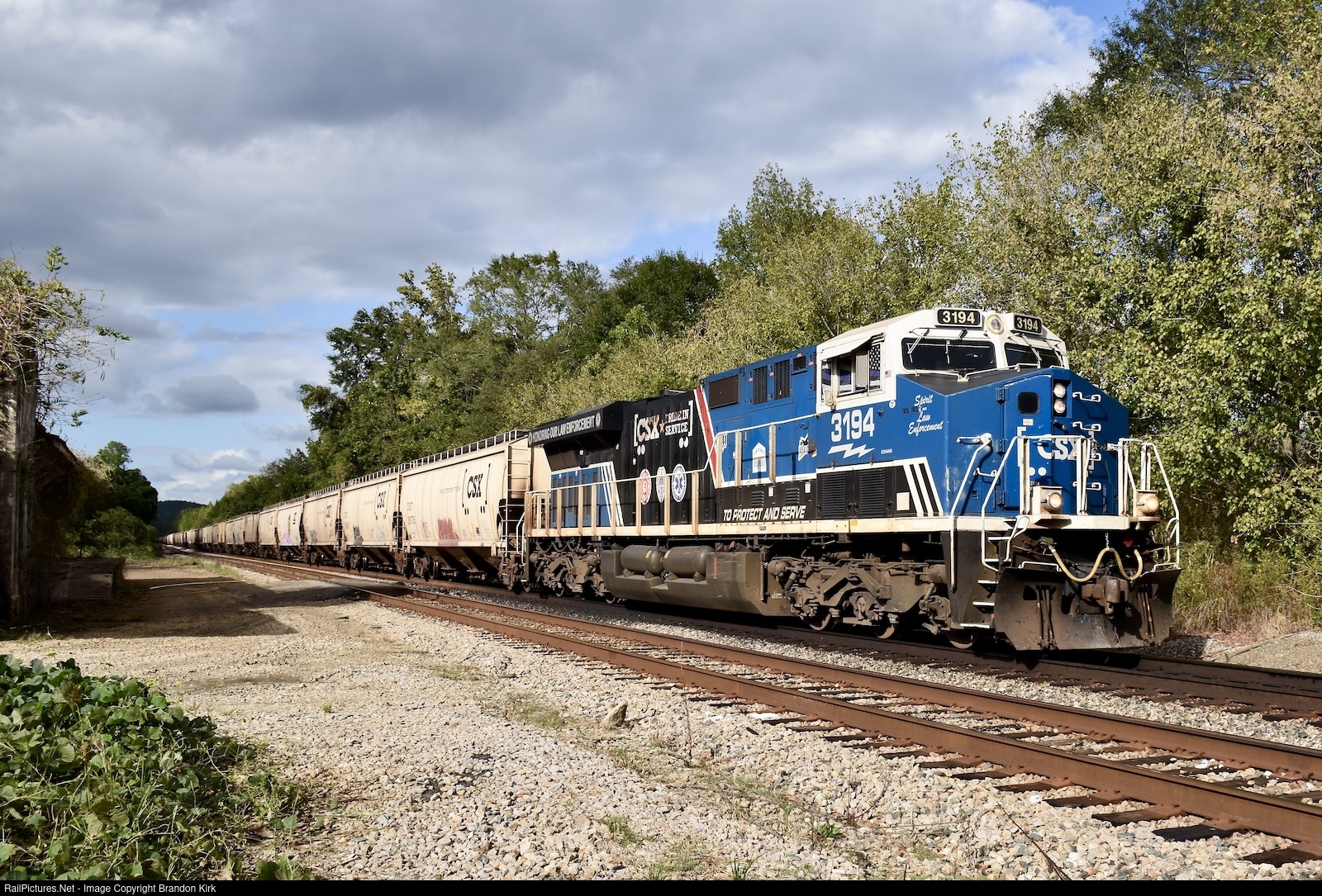 | Heading south through Wadley, 88 cars of grain are being escorted by two CSXT Pride in Service locomotives. Leading is CSXT #3194 "Spirit of Our Law Enforcement" and mid-train DPU is "Spirit of Our Armed Forces #1776". |