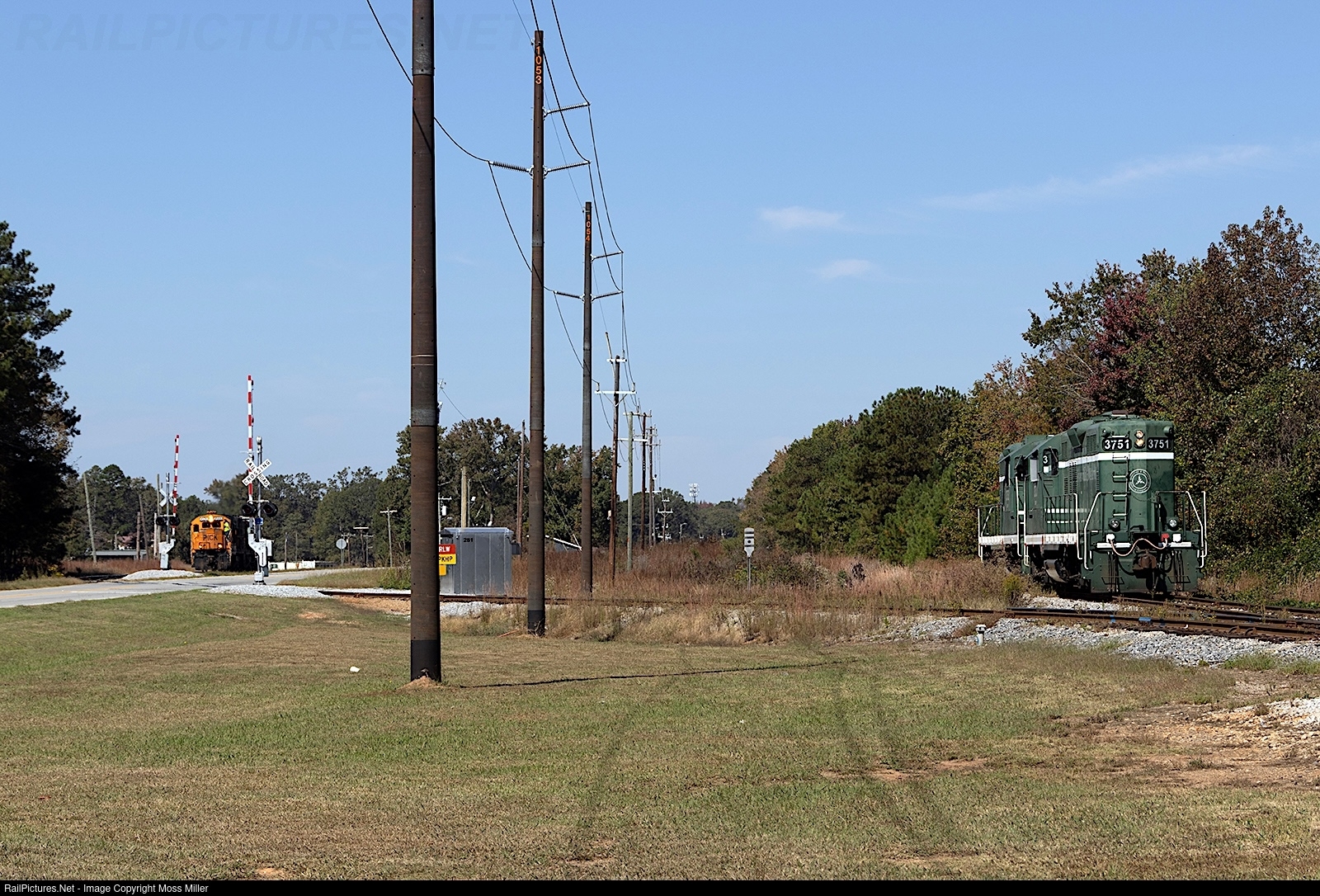 Shortline railroading at its finest! Pickens Railway’s “Belton Job” has arrived at the interchange with the Greenville and Western in Belton, SC and prepares to cross Belton-Honea Path Highway with 13 cars in tow. To the right of the photo is the GRLW crew with GP9s #3751 and #3752. Once the GRLW received the cut of cars from the PKHP, they would immediately head north to Pelzer to drop them off for a CSX local to pick up and open them up to the national rail network.