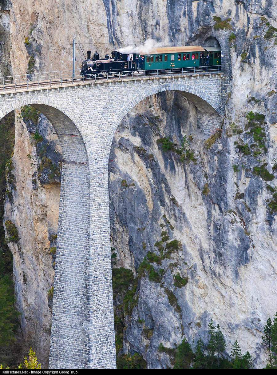 The journey out of the tunnel and directly onto the 65-meter-high Landwasser Viaduct, which is built on a curve with a radius of 100 meters, always offers a spectacular moment. In a steam train, even on the open platform, it is even more exciting. The Rhätische Bahn's G 3/4 # 11 “Heidi” steam locomotive, which is the same age as the viaduct, pulls the Albulatal steam train from Samedan to Surava.