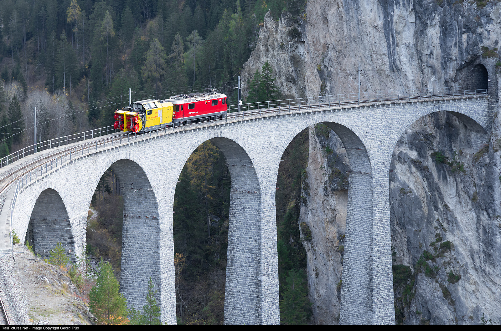 | The Rhaetian Railway's 9129 freight train from Landquart to Samedan crosses the 65-meter-high Landwasser Viaduct. Locomotive Ge 4/4 II # 625 pulls the Bernina Line's snowplow Xrotm # 95404 to its location in Pontresina or Poschiavo. |