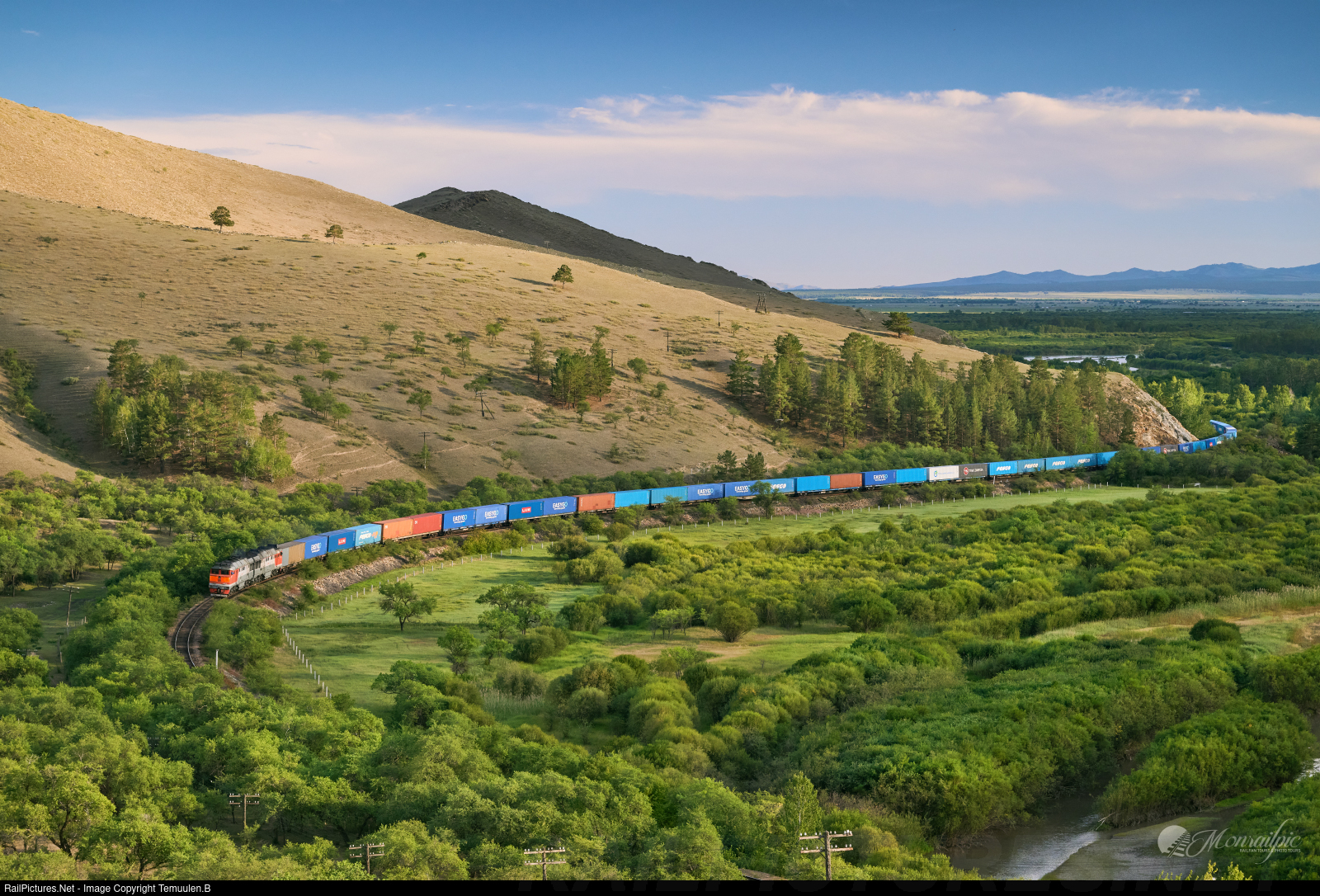 | A Russian Railways rented locomotive 2TE116-1585, heads north toward Russia with a container train running along the scenic Selenge River basin, near the Mongolia–Russia border zone. This photo was taken during another successful Summer Group Tour organized last August in the northern section of the Trans-Mongolian Railway. Pre-registration for our 2026 group & private tours is OPEN!