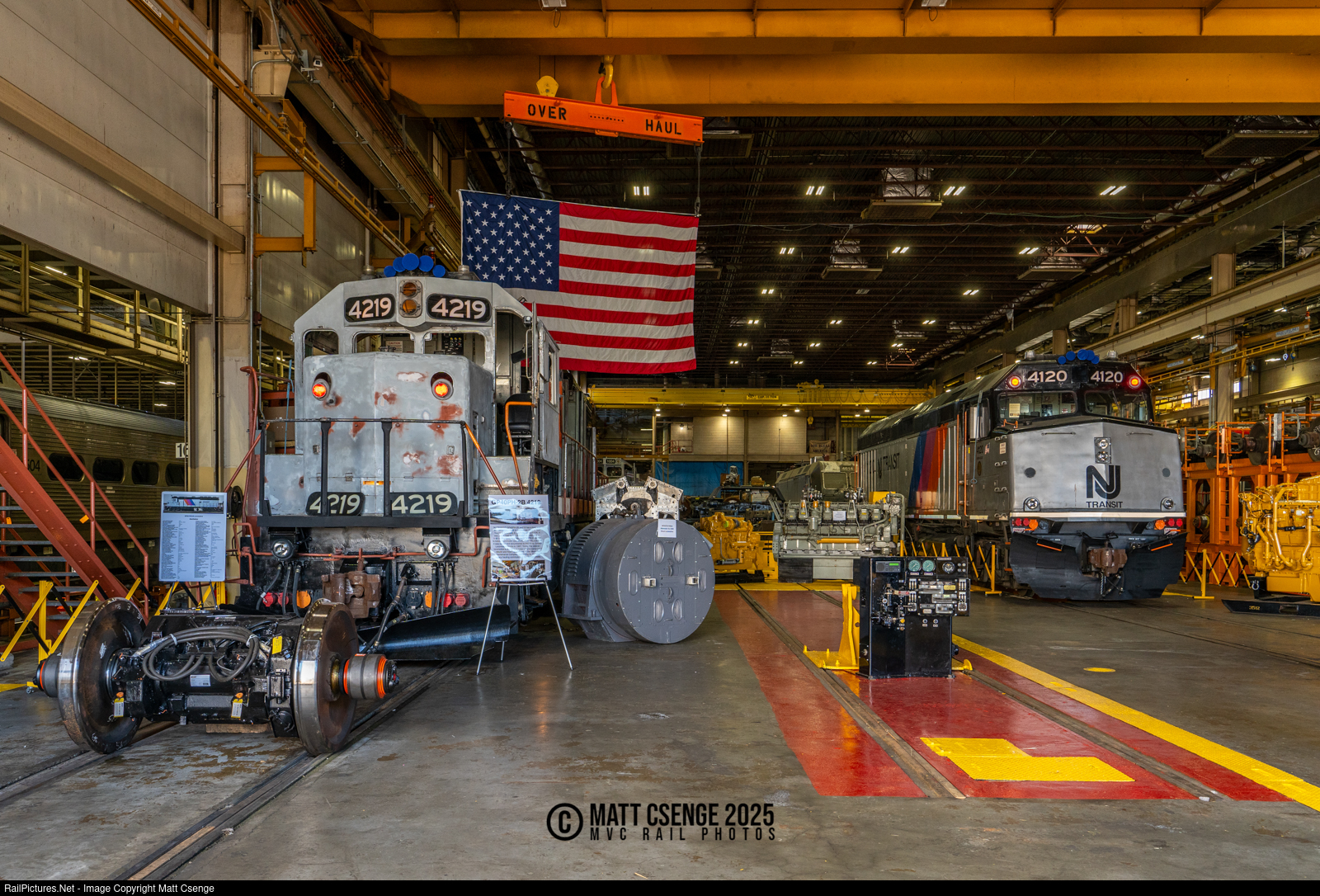 NJ Transit GP40PH-2B no. 4219 and F40PH-2CAT no. 4120 are seen on display during the annual Family Day event at the Meadows Maintenance Complex (MMC). The MMC is the railroad's heavy maintenance shop, capable of rebuilding and maintaining rolling stock in the 13,000 square-foot facility. Locomotive 4219 is currently in the process of being rebuilt, stripped of paint and with most of its mechanical components removed. |