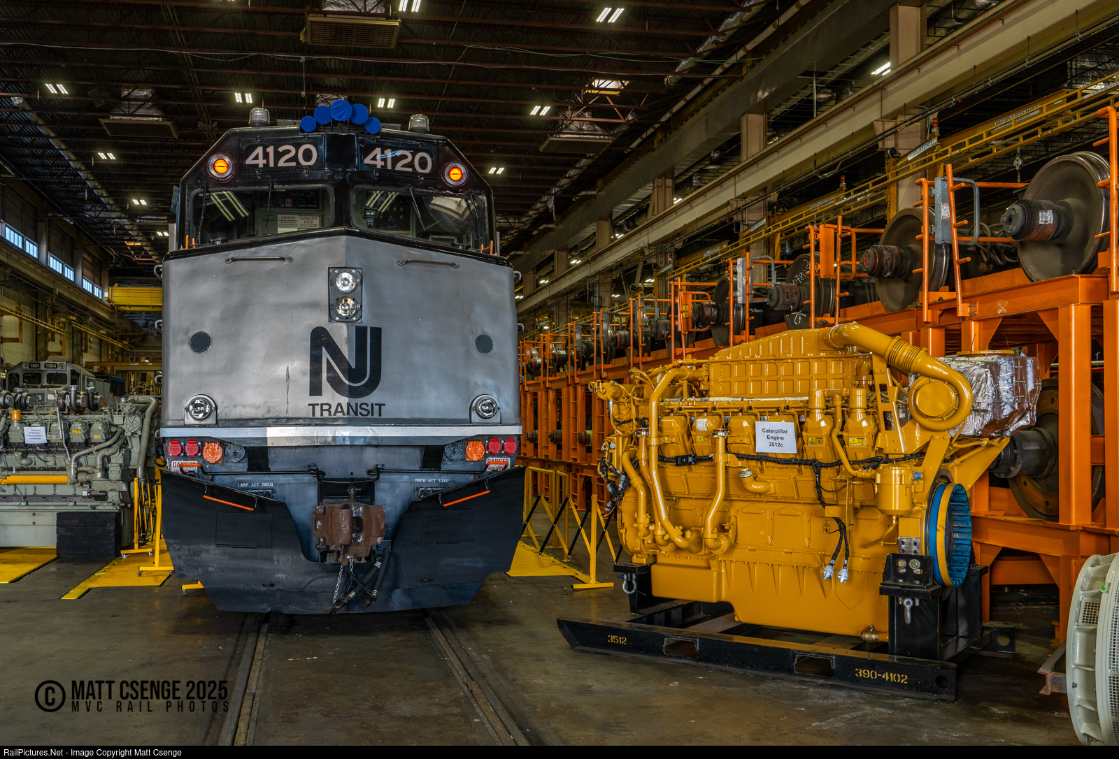 NJ Transit F40PH-2CAT no. 4120 is seen on display at the annual Family Day event at the Meadows Maintenance Complex. As the model designation suggests, the locomotive and sister 4119 have been repowered with Caterpillar prime movers, one of which can be seen on display next to the unit. |