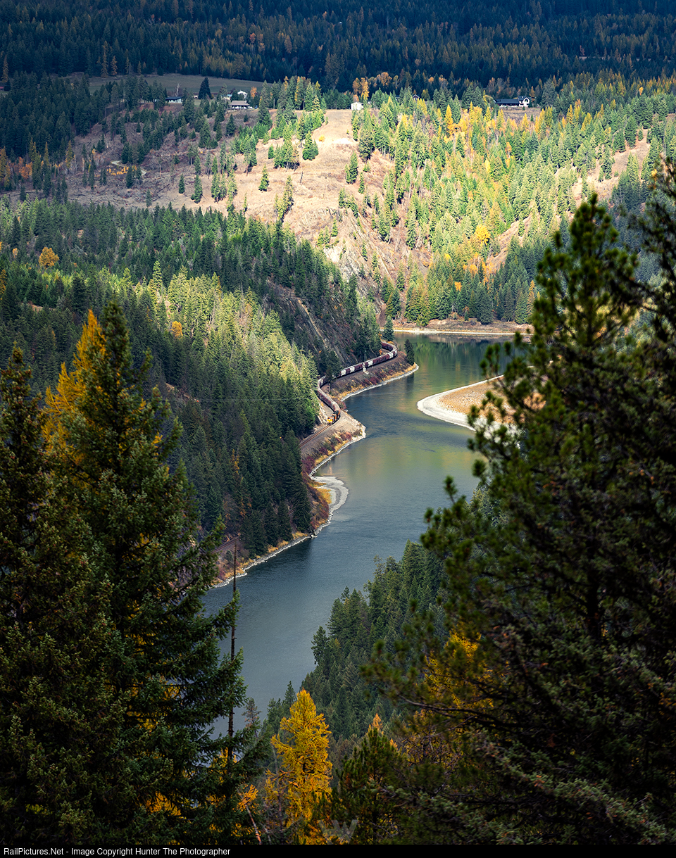| With the sun starting to breach the cloudy skies of Sunday, October 26, 2025, an eastbound grain train parallels the Kootenai River at Katka, ID.