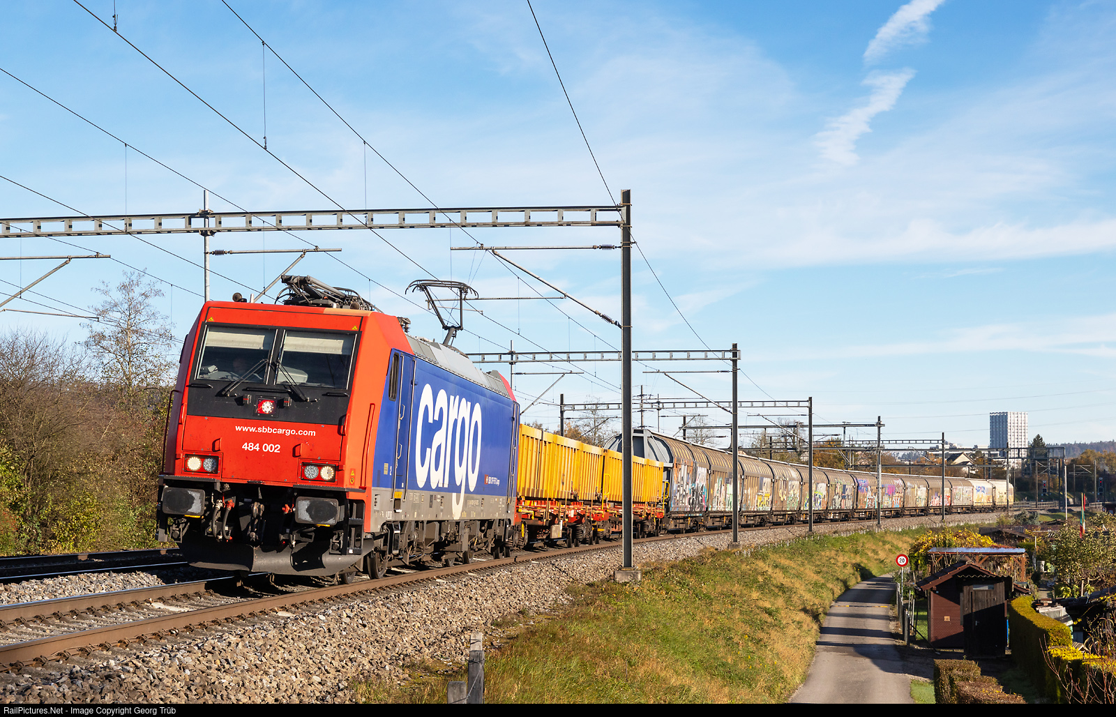 | Bombardier TRAXX F140 MS Re 484 # 002 of the SBB pulls the freight train 63120 from Gossau SG via Winterthur-Kloten-Regensdorf to the Limmattal shunting yard (RBL), between Winterthur and Winterthur Tössmühle. |