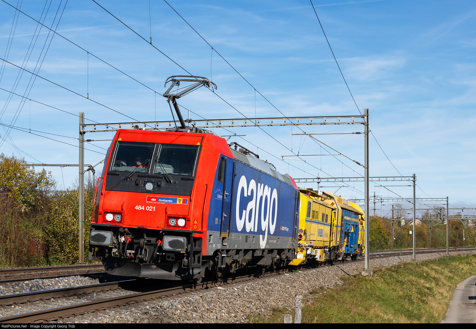 | Bombardier TRAXX F140 MS Re 484 # 021 "Gottardo" of the SBB pulls the freight train 69232 from Winterthur freight yard via Kloten-Regensdorf to the Limmattal shunting yard (RBL), between Winterthur and Winterthur Tössmühle. The load is the Plasser and Theurer tamping machine Unimat 09-32/4S of the Krebs Gleisbau company. The Unimat 09-32/4S is designed as a three-part vehicle. The main section of the machine is carried by two 2-axled bogies. The main frame is arched and encompasses the moving sub frame (‘satellite’) which carries all working units of the tamping machine. The satellite is supported on the track at the rear on a 2-axled bogie and is connected to the machine’s main frame at the front via a longitudinal roller guide. The 2-axled, bogie-mounted trailer, which carries the fuel tank with a capacity of 4,500 litres and a cabin for driving during transfer, is positioned directly behind the main section. |