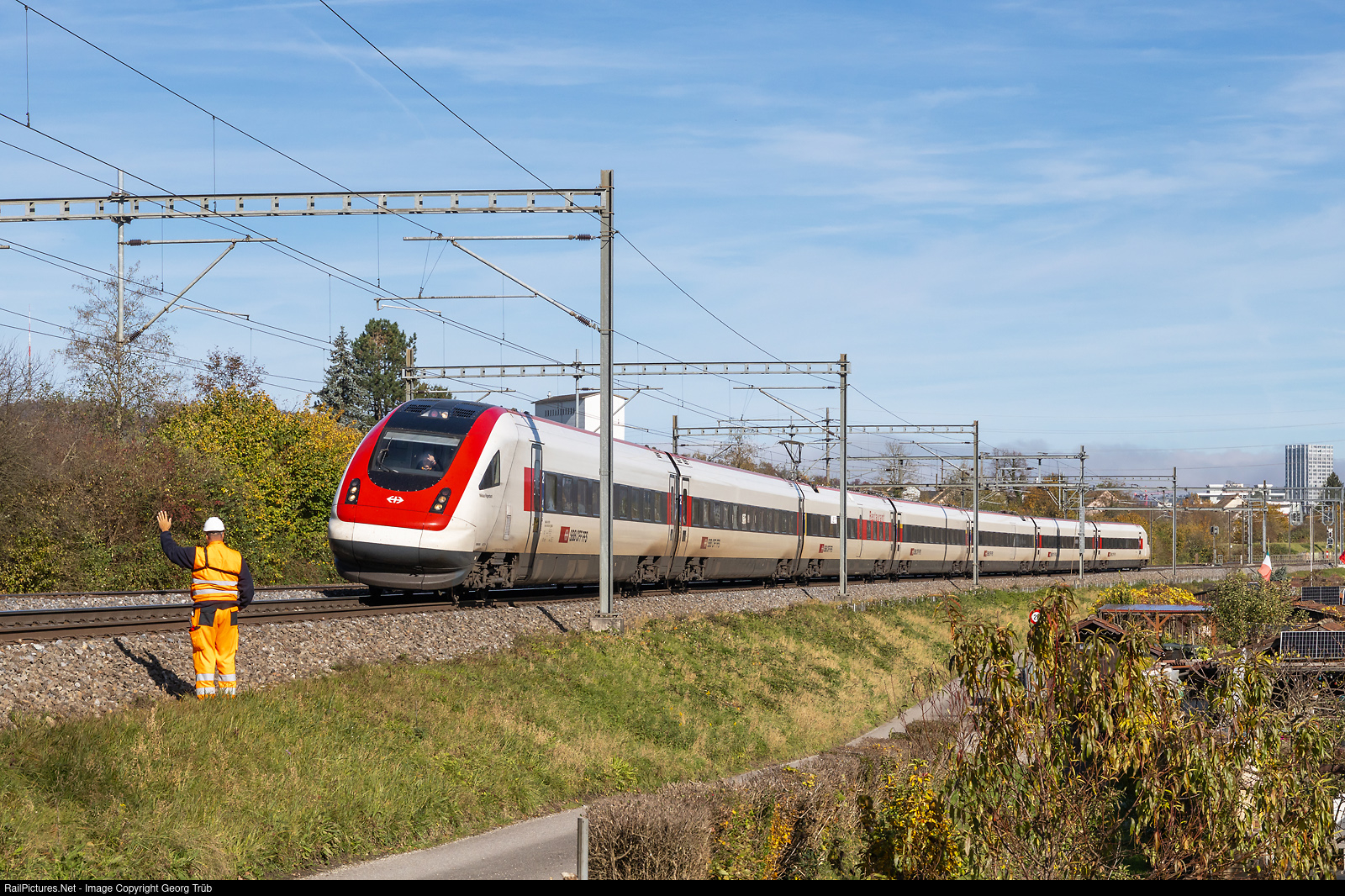 | Intercity tilting train ICN RABDe 500 # 035 "Niklaus Riggenbach" is running the IC 1518 of the line IC5 from St.Gallen via Winterthur-Zürich-Olten-Biel-Neuchâtel to Lausanne, between Winterthur and Winterthur Tössmühle. A safety guard is greeting the driver. |