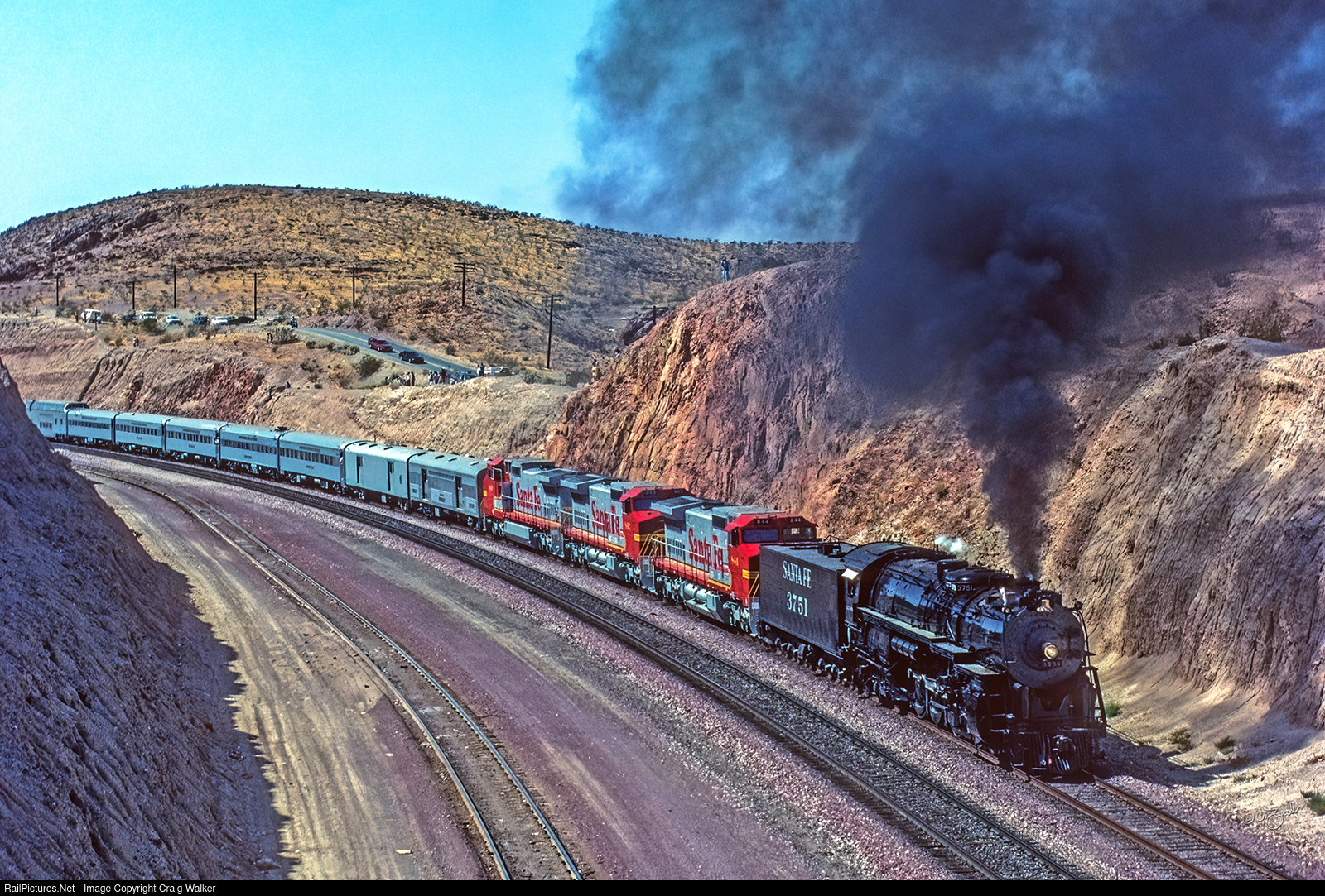 On the first day of a journey from Los Angeles to Chicago, Santa Fe 4-8-4 3751 and a trio of Dash 8-40CW diesels pull an excursion train across the Atchison Topeka & Santa Fe Railway as a treat for the employees lucky enough to score a ticket for this train and ride it for a few hours between division points. After a stop in Barstow to exchange passengers, the train is on the move again. It will spend the night in Needles and resume its eastward journey in the morning. (Barstow, California – April 30, 1986)