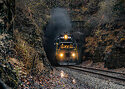 The mountain local blasts out of a tunnel deep in the heart of the mountains.