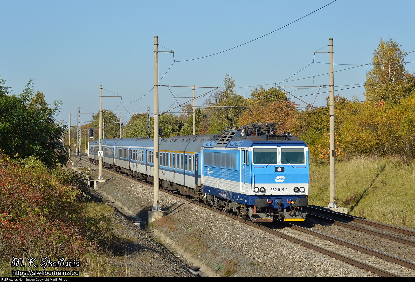 The electric locomotive 362.019-2 hauling a passenger train from Bohumin hl. n to Praha hl. n.