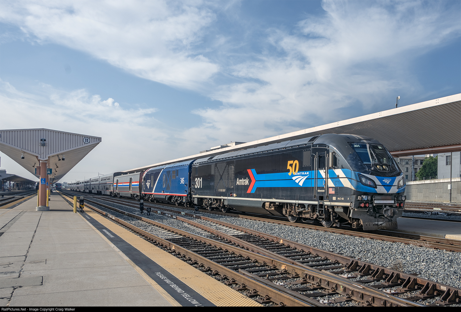 It is Hallowe'en, so perhaps it is fitting that Amtrak train 14, the northbound Coast Starlight, head ALC-42 301 on the headend, as it wears a unique paint scheme celebrating the carrier's 50th Anniversary in 2021. A costume, of sorts ... but not a scary one! There was only one other Amtrak locomotive to wear this scheme, and it was the very first locomotive to wear an Amtrak scheme: Amtrak E8A 4316. Or, was it Penn Central 4316, painted in a proposed scheme for the new passenger carrier?