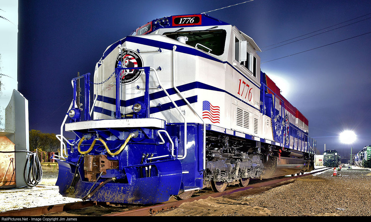 | The United States of America's 250th anniversary of freedom and the signing of the Declaration of Independence in July of 1776 draws near. The Lake State Railway's dedication to our country is more than noteworthy as evidenced by the salutary paint scheme on their '1776' locomotive. |