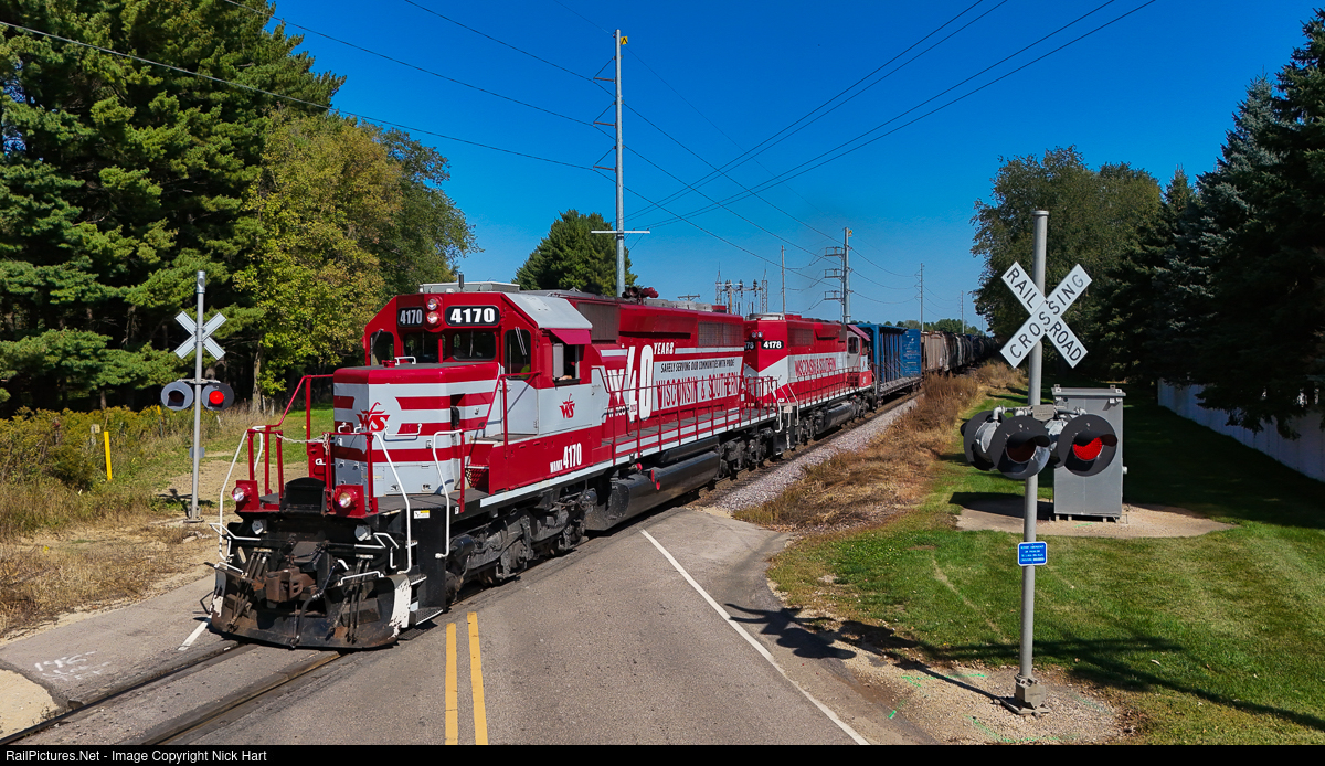| T6 takes a pull at Rotamer as the crew prepares to perform a bit of switching. WAMX 4170 and 4178, both SD40-2's, provide the power on this beautiful morning. |