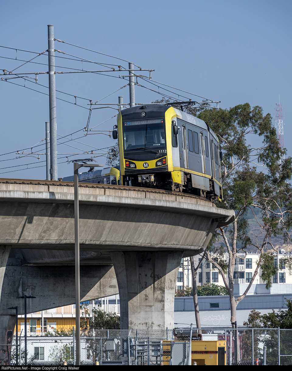 LAMTA P3010 1112, one of a group of light rail vehicles constructed by Kinki Sharyo between 2014 and 2020, has departed Chinatown and is rounding the elevated trackage that takes it into Los Angeles Union Station. (Los Angeles, California - October 31, 2025)