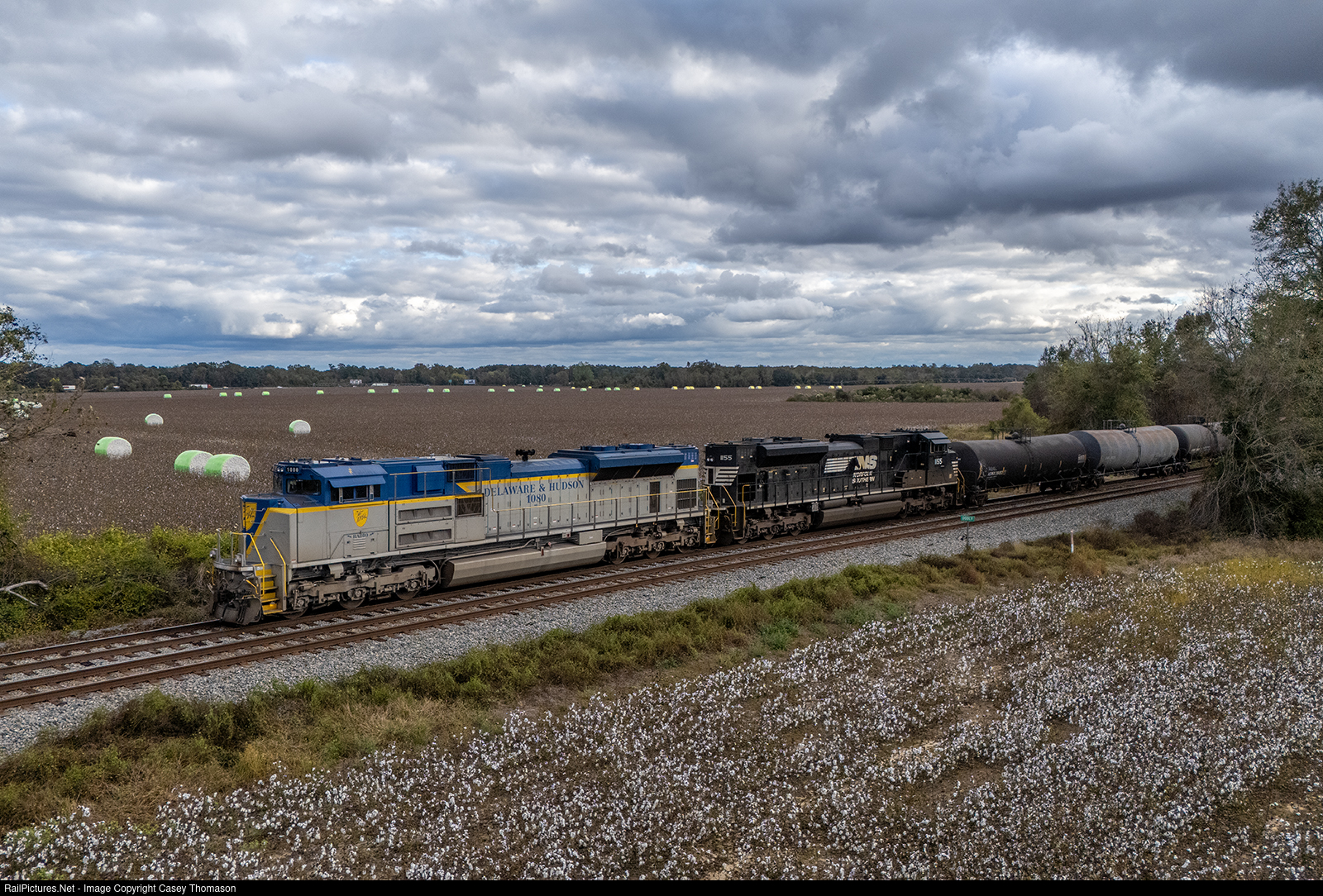 | The Delaware & Hudson heritage unit leads NS train 152 north through a cotton field near Unadilla, Georgia. |