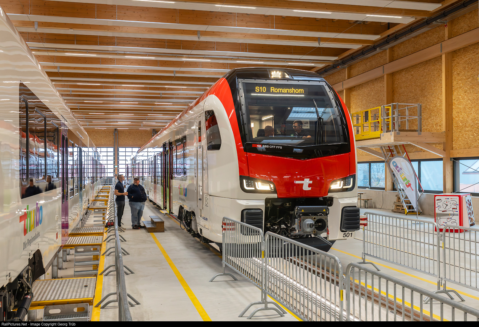 | Thurbo, the regional transport company for eastern Switzerland and a subsidiary of SBB and the canton of Thurgau, launched its new service facility in Weinfelden on this day. During an open house, interested members of the public were able to visit the hall with its five tracks and view the new “Flirt Evo” trains from StadlerRail for Thurbo. Here is the four-car RABe 533 # 501 (the first in a series of 19 trains) in the new hall in Weinfelden.