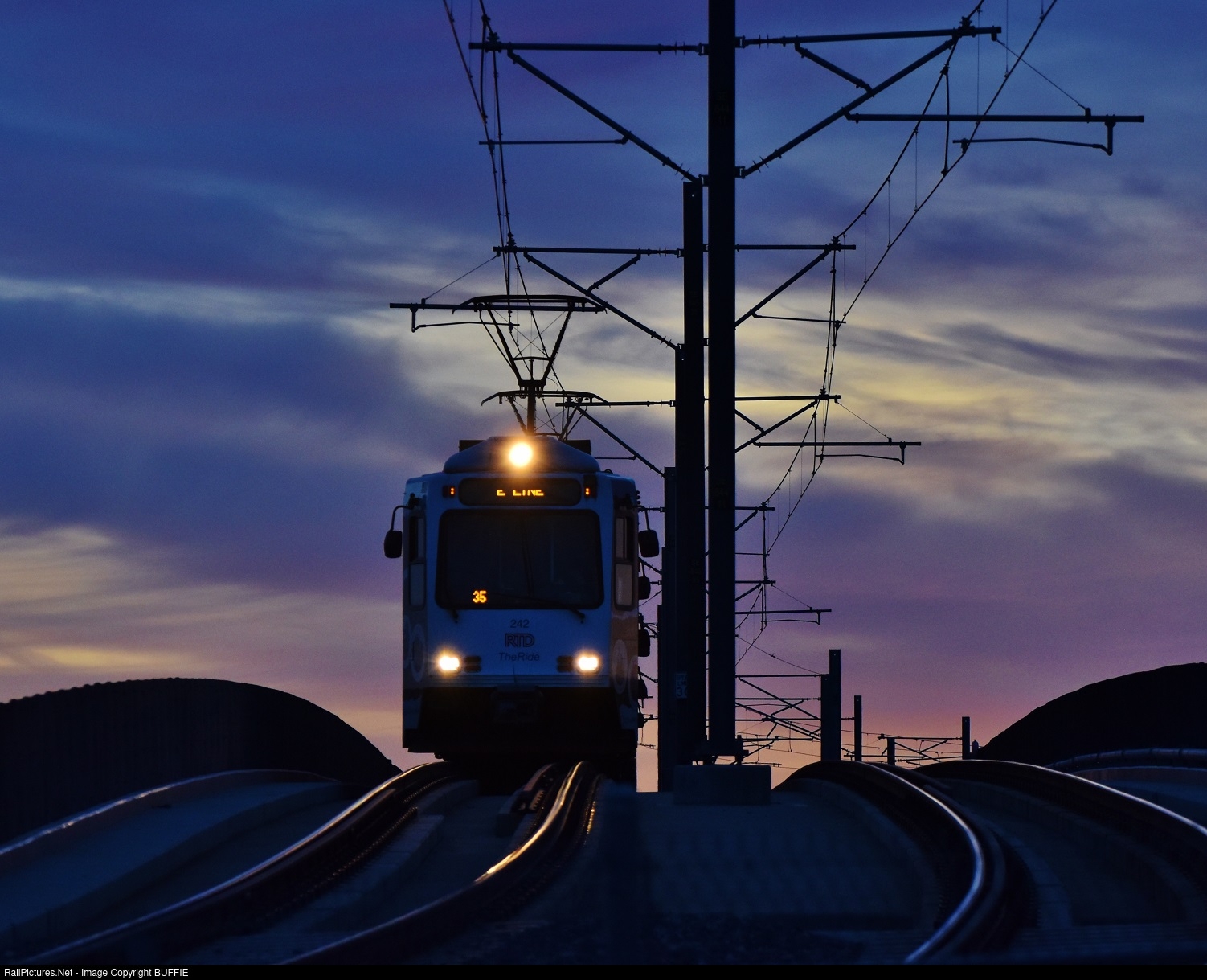 | It is Blue Hour on the Colorado Front Range as RTD light rail train #242 runs over a bridge spanning I-25 in Centennial, Colorado.
