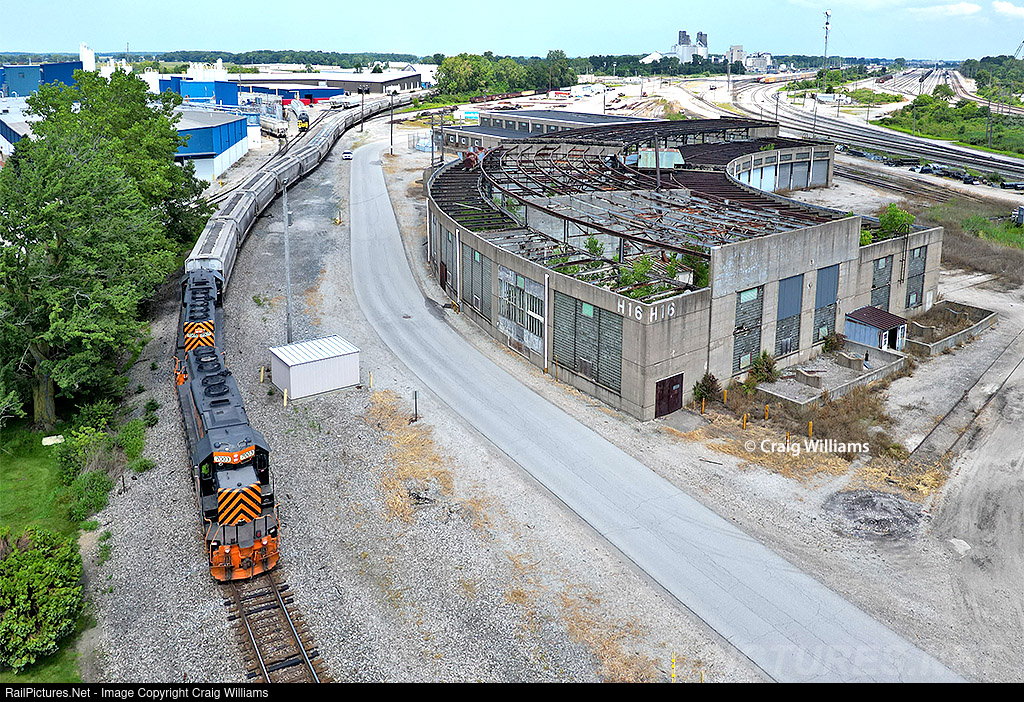 The Hartland local spotted and pulled the Bunge Elevator at Bellevue on Tuesday. The job uses NS trackage to access the plant on the north side of their yard. Here the job heads back with 20 loads as they pull into the Sandusky District off the elevator lead and pass the old roundhouse.
