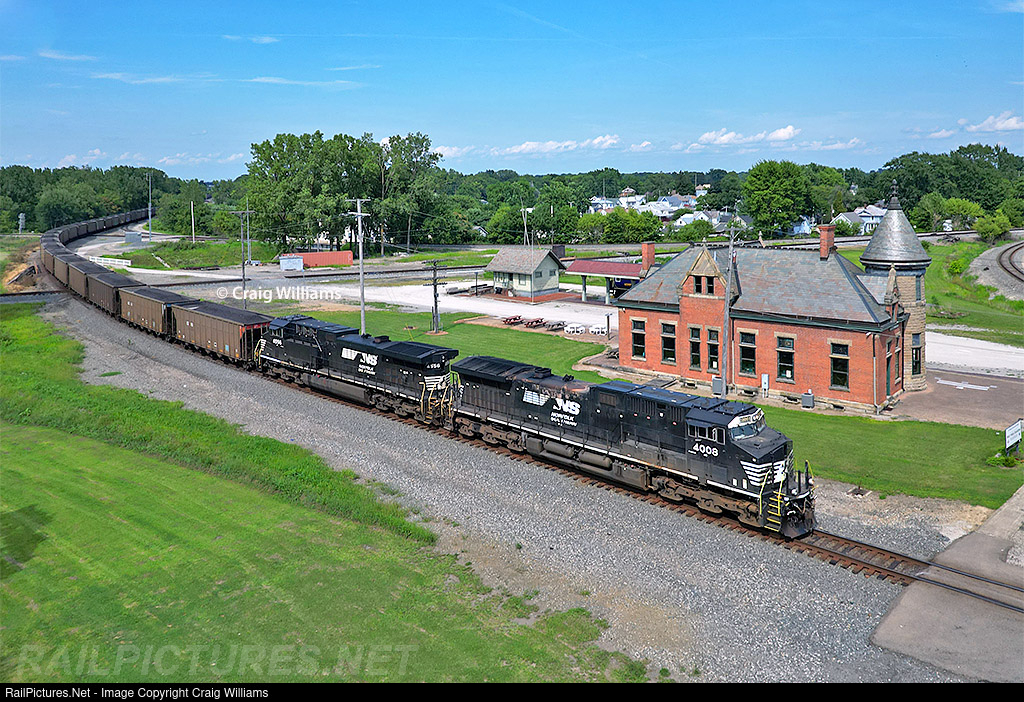 A loaded coal train, 746, rolls past the depot as they make their way east (south) on the Sandusky District. The 110-car train is bound for the Duke Energy Plant in Belews Creek, NC. The train has just crossed the CF&E Lima Sub.