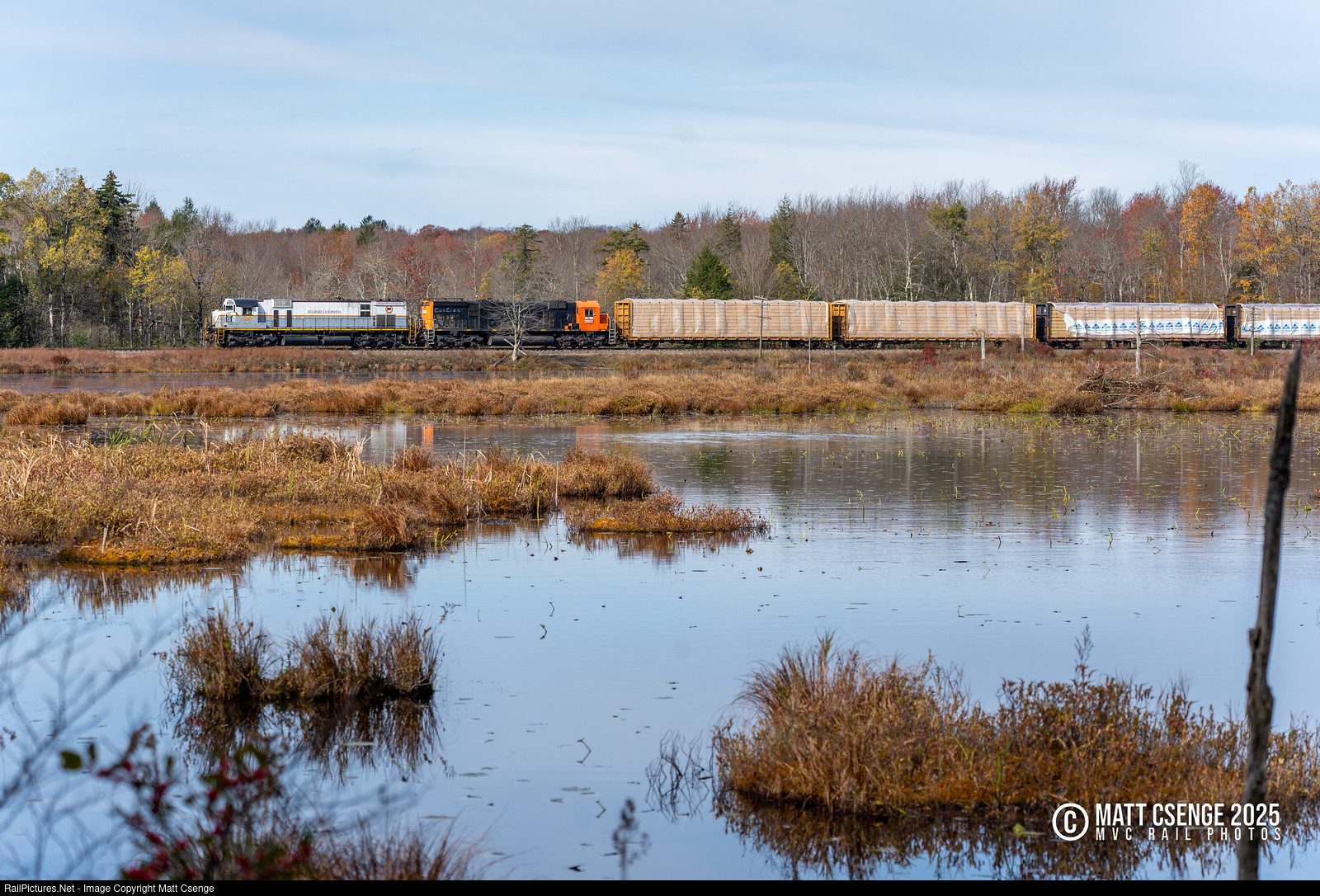 With the last remnants of fall foliage still clinging to the trees, Delaware-Lackawanna Railroad (DL) M630 no. 3000 and M636 no. 3602 are seen leading train PO-74 along Snag Pond as they head south to Slateford Junction. |