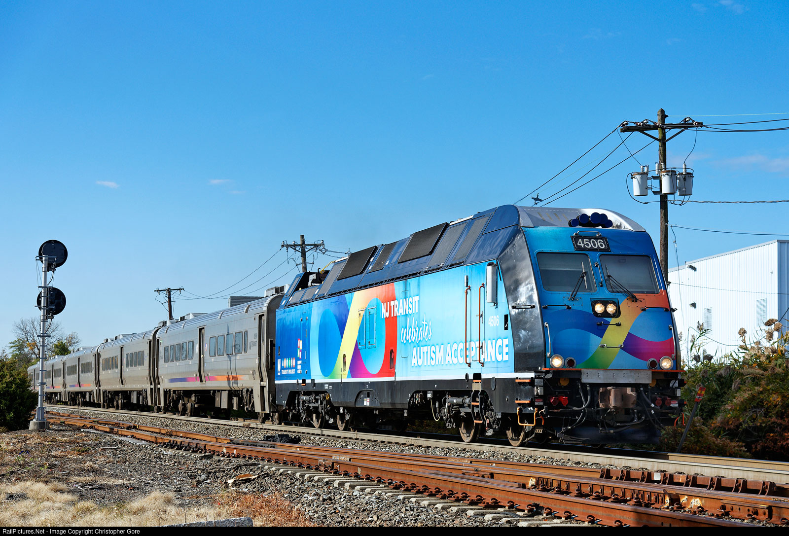 Autism Acceptance wrapped ALP-45DP leading NJ Transit train 1651 at Wood-Ridge.