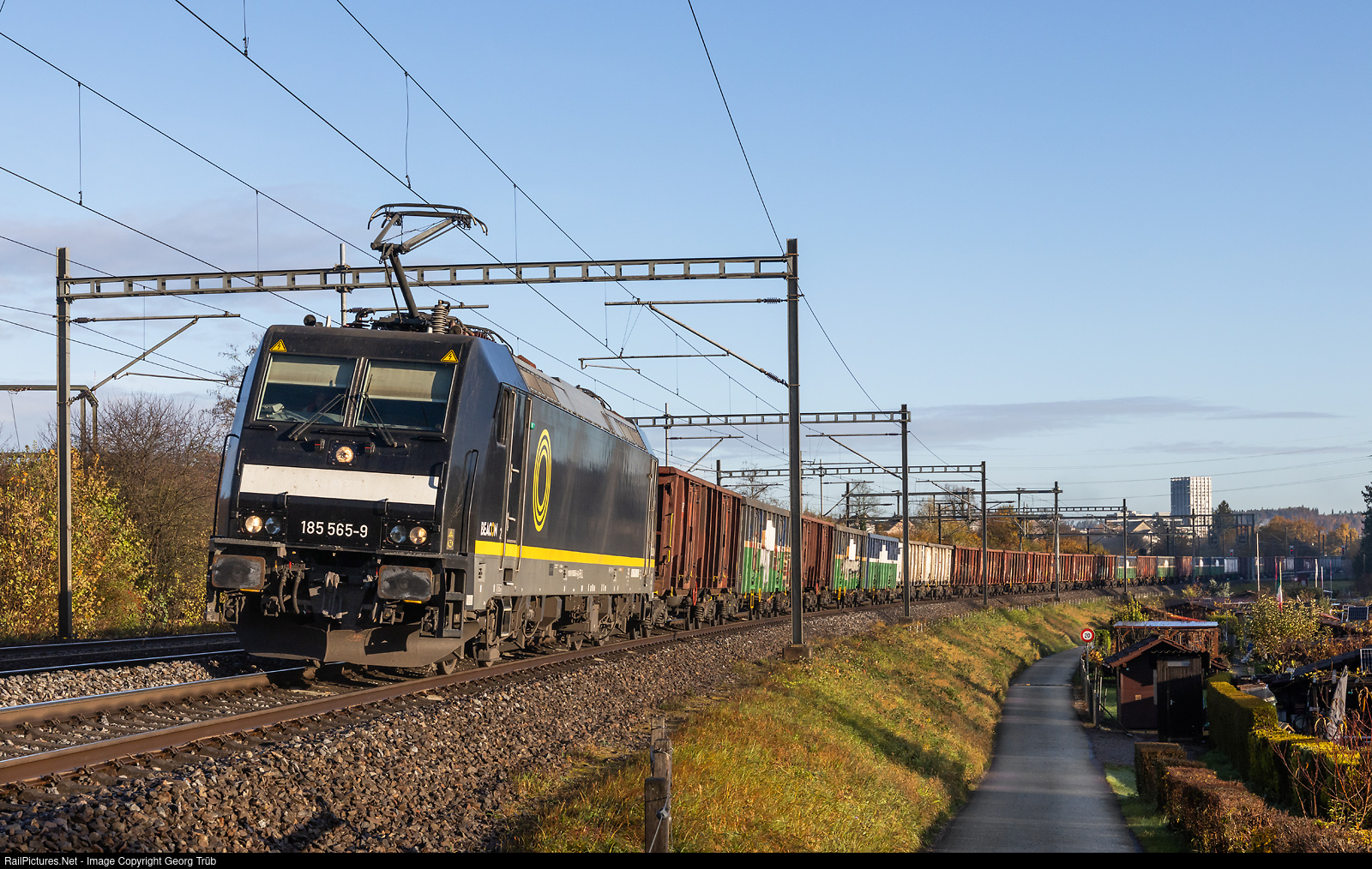 | Bombardier TRAXX F140 AC2 185 # 565 of Beacon Rail, which was hired by about 20 different railways since 2005, now running for TXLogistik, pulls the about 530 meter long emtpy sugar beat train 45640 from Islikon via Winterthur-Kloten-Zürich Oerlikon-Zürich Altstetten-Brugg-Bözberg-Basel to Wismar/Germany, between Winterthur and Winterthur Tössmühle. The train ran for TXLCH in Switzerland. In Germany probably for HSL. |