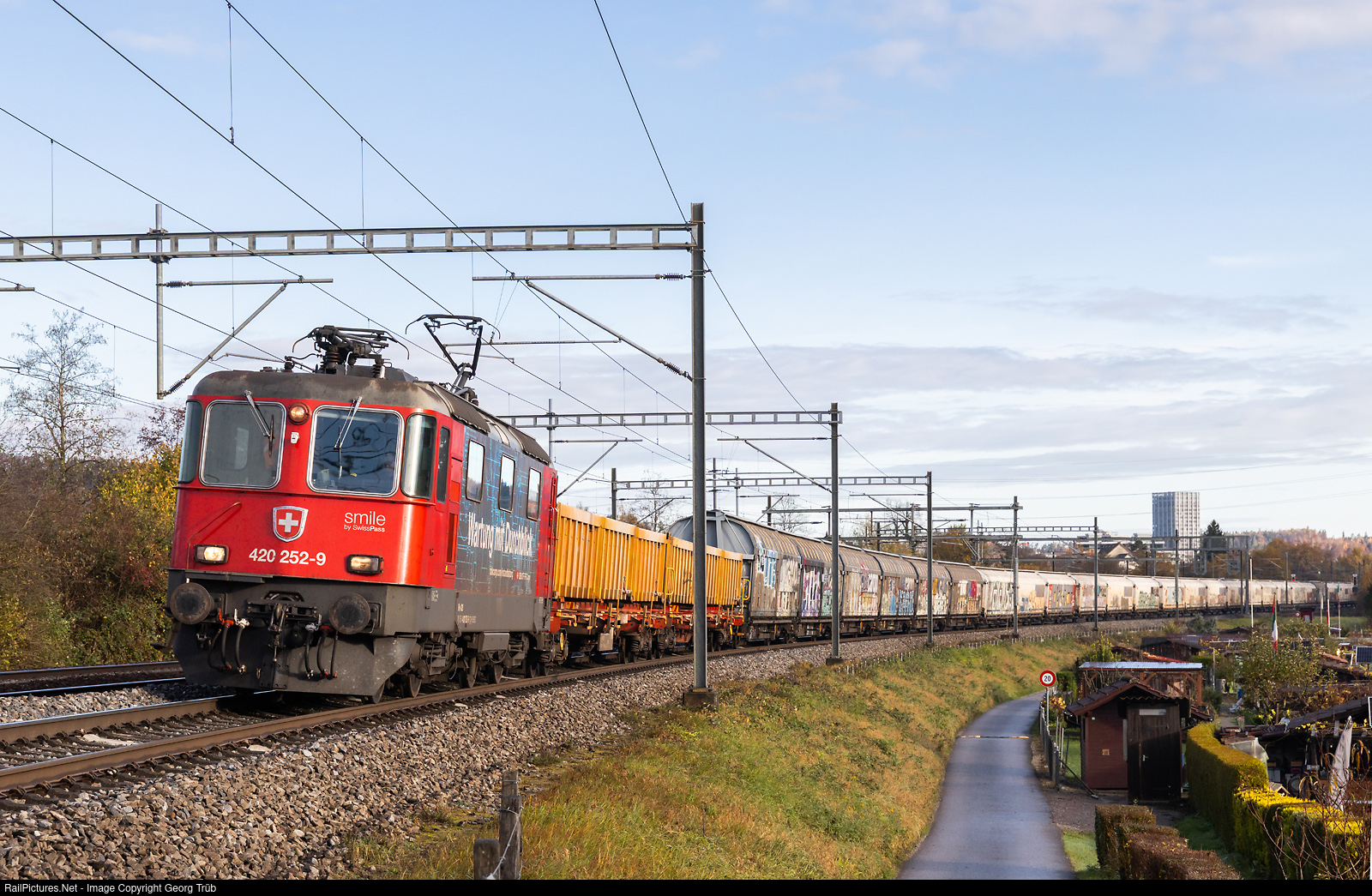 | Re 420 # 252 (Re 4/4 II # 11252) of the SBB, in the "Smile"/"Wartung mit Durchblick" paint scheme, pulls the 500 meter long freight train 63120 from Gossau SG via Winterthur-Kloten-Regensdorf to the Limmattal shunting yard, between Winterthur and Winterthur Tössmühle. |