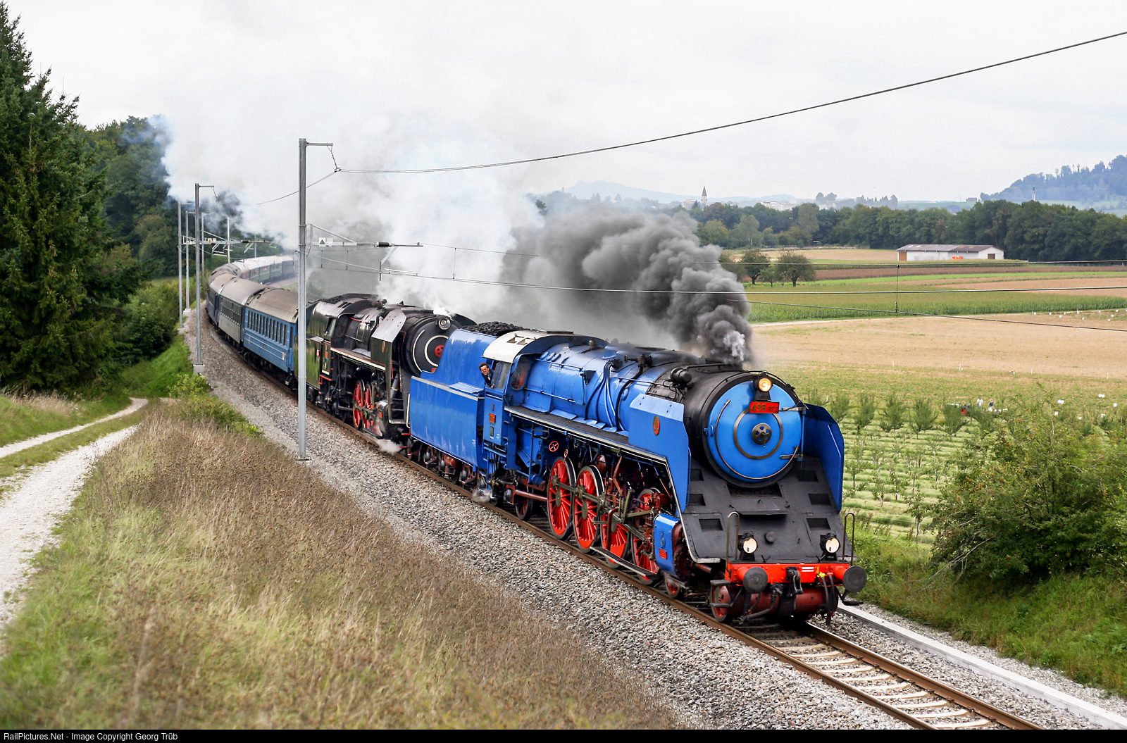 In 2007, 125 years of the famous Gotthard line was celebrated. The large festival in Erstfeld and Biasca at the beginning of September 2007 was attended by about 50000 people. The organizer of the numerous attractions, Diego Marti from the SBB, had relations with the Czech state railway and the original idea to invite an extra train with the beautiful steam locomotives of the Ceske Drahy to Switzerland. Due to profile problems it was not possible to drive the big steam locomotives through the tunnels of the mountain line, but the train ran with steam from the Czech Republic to Erstfeld. The train reached Switzerland via Singen and in Schaffhausen water and coal was collected. Now the mighty three cylinder "Mountain" 4-8-2 498 # 022 "Albatros", built in 1946 by Škoda, Plzen, and the two cylinder 4-8-2 475 # 179 "Šlechtina" (noblewoman) are on the way with the special train from Schaffhausen to Erstfeld, running on the SBB line over the german territory between Neuhausen and Altenburg-Rheinau towards Eglisau-Bülach. The grade is 1.2 % in this part of the line.