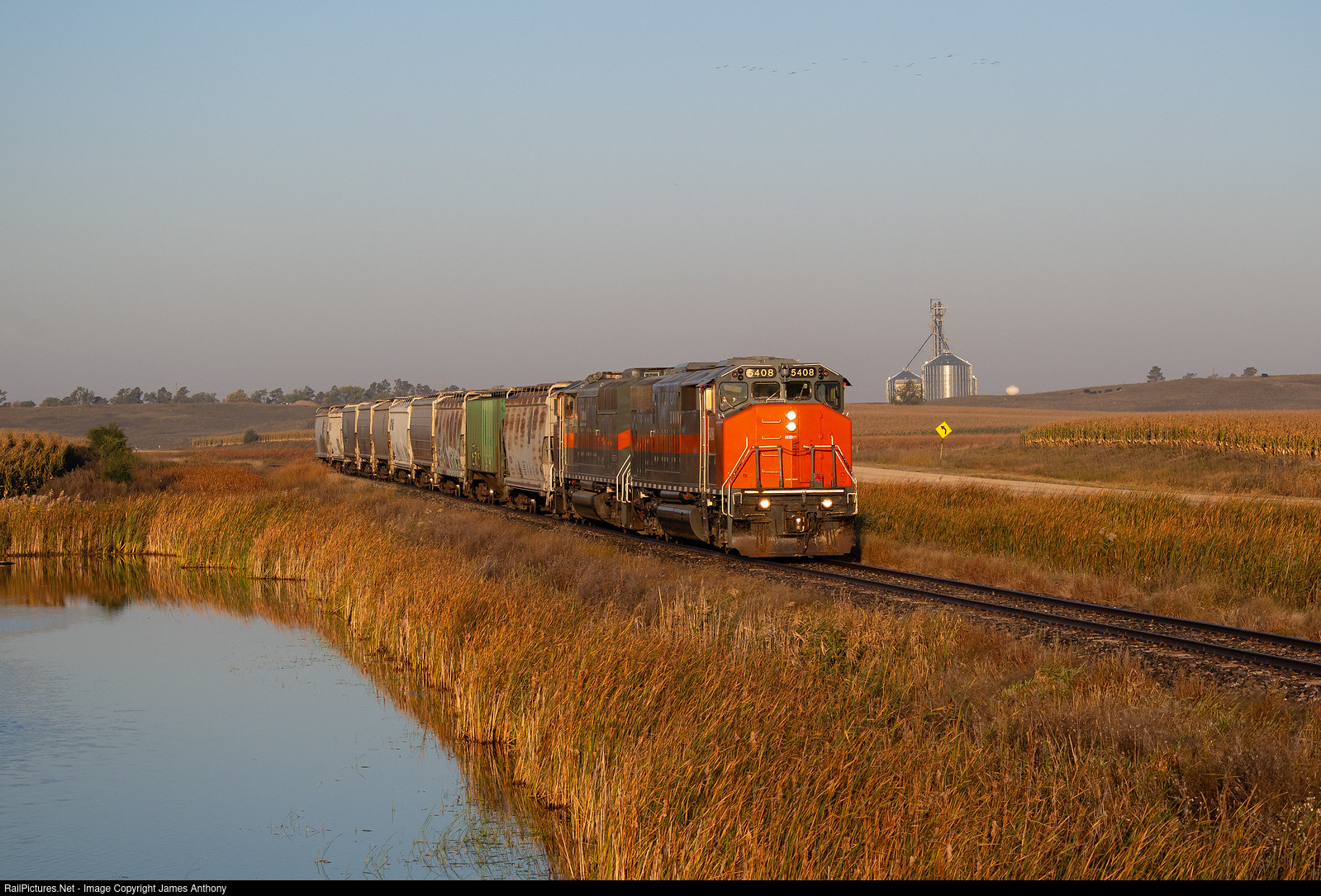 | DMVW Oakes Division Train JDM202 getting started EB to Hankinson to interchange 9 cars from the Wheat House in Oakes, they just outside of town and slowly making their way into the Southern ND Farmland Hills & Pothole Lakes. |