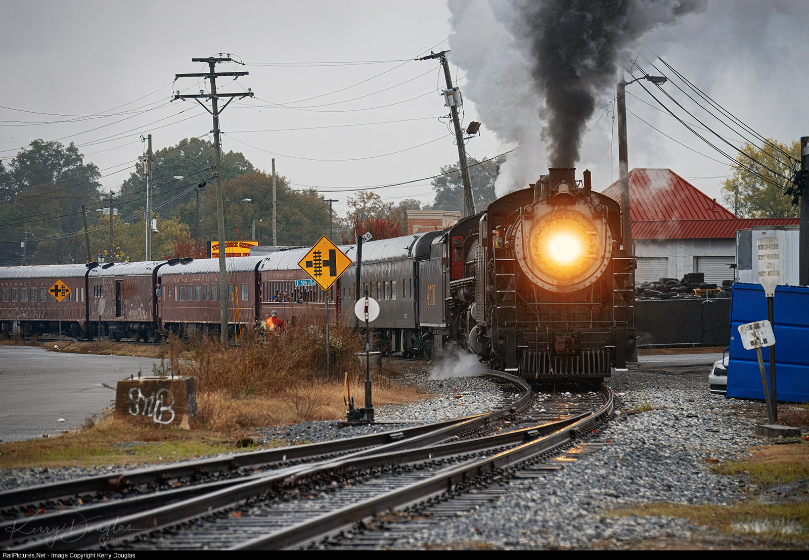 In the cold autumn rain both Southern Railway No. 630 and 4501 march in step as the steam excursion leave Norfolk Southern's Trackage at the Stateline and begin the journey south on the G&W-Chattooga & Chickamauga. The train will make a stop at West Gordon Ave to flag the crossing before No. 630 Farewell run continuing south