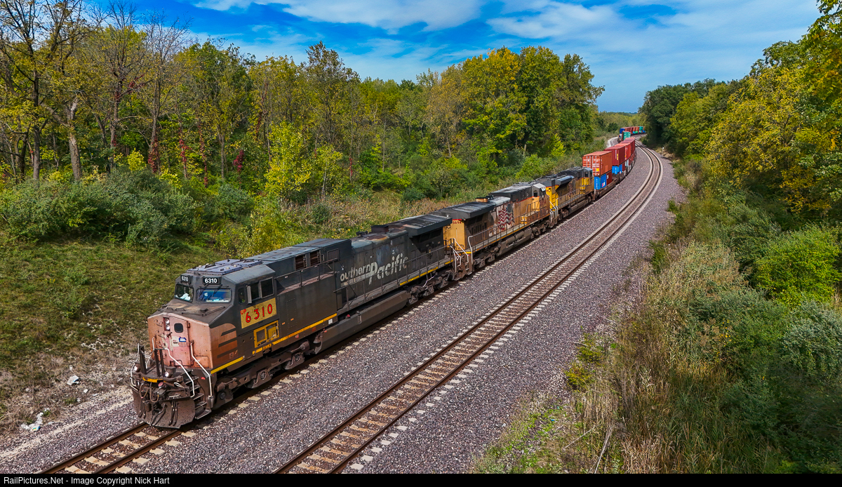 Climbing Zarley's Hill. UP AC4400CW #6310 is in charge of INPG4X, an extra intermodal/double stack train from North Platte, as it makes its way up Zarley's Hill in Joliet. At the present time, 6310 is one of five AC4400CW's left in Southern Pacific paint. If I were a betting man, I'd say this unit has passed this location more than a few times during its days as the SP 264.
