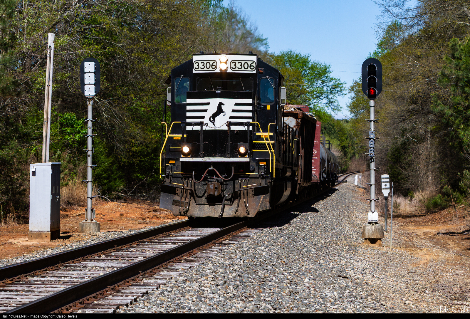 | NS SD40-2 #3306 brings NS P83 the "Rouster Job" eastbound through the automatic signals at the W58.5. After spending over two hours working Associated Asphalt just west of here, they would head back towards Hayne with only one more stop to work Concrete Supply at the W61. |