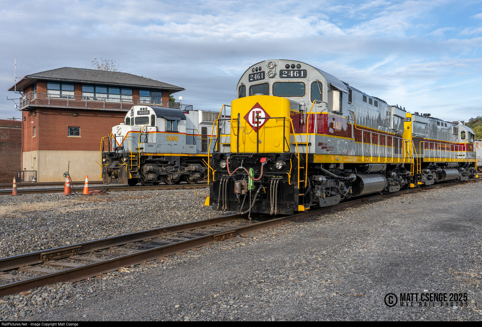 Delaware-Lackawanna Railroad (DL) four and six-axle power is seen at Bridge 60 on an autumn Saturday morning. ALCO C425 no.s 2461 and 2452 sit quietly in their new Erie Lackawanna heritage schemes while C630 no. 3000 shuffles around preparing train PO-74 for the day's run to Slateford Junction. |