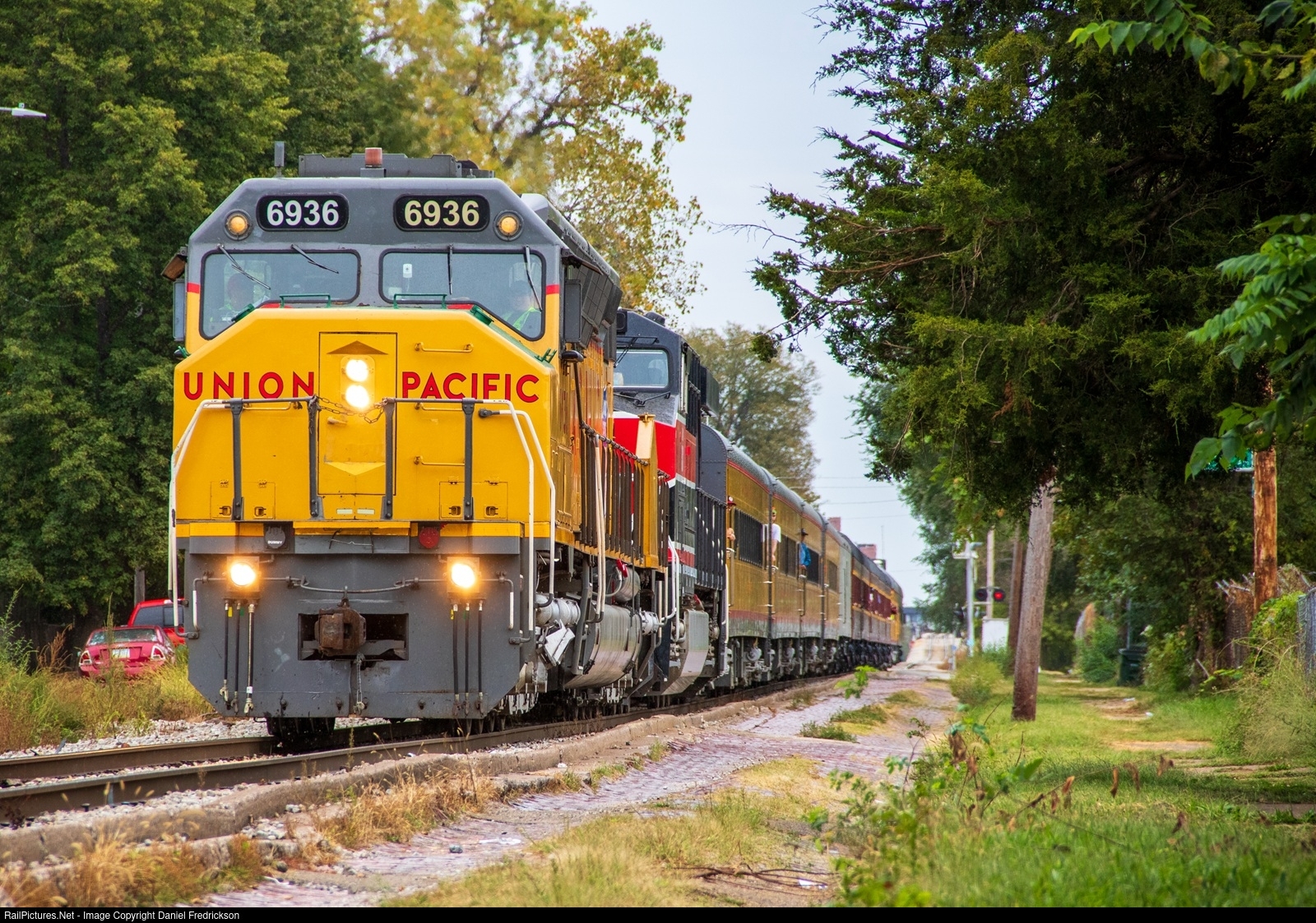The Railroading Heritage of Midwest America organization operated two days of excursions with restored DDA40X "Centennial" locomotive #6936, with Iowa Interstate providing ES44AC #513 for backup. The trainset operated one round trip per day - west towards South Amana, IA on 9/20 and east to Bureau Junction, IL on 9/21, both trips originating in Silvis, IL. Here, the South Amana trip traverses street trackage along 5th Street in downtown Davenport, IA, on its way to the picnic stop in Wilton.