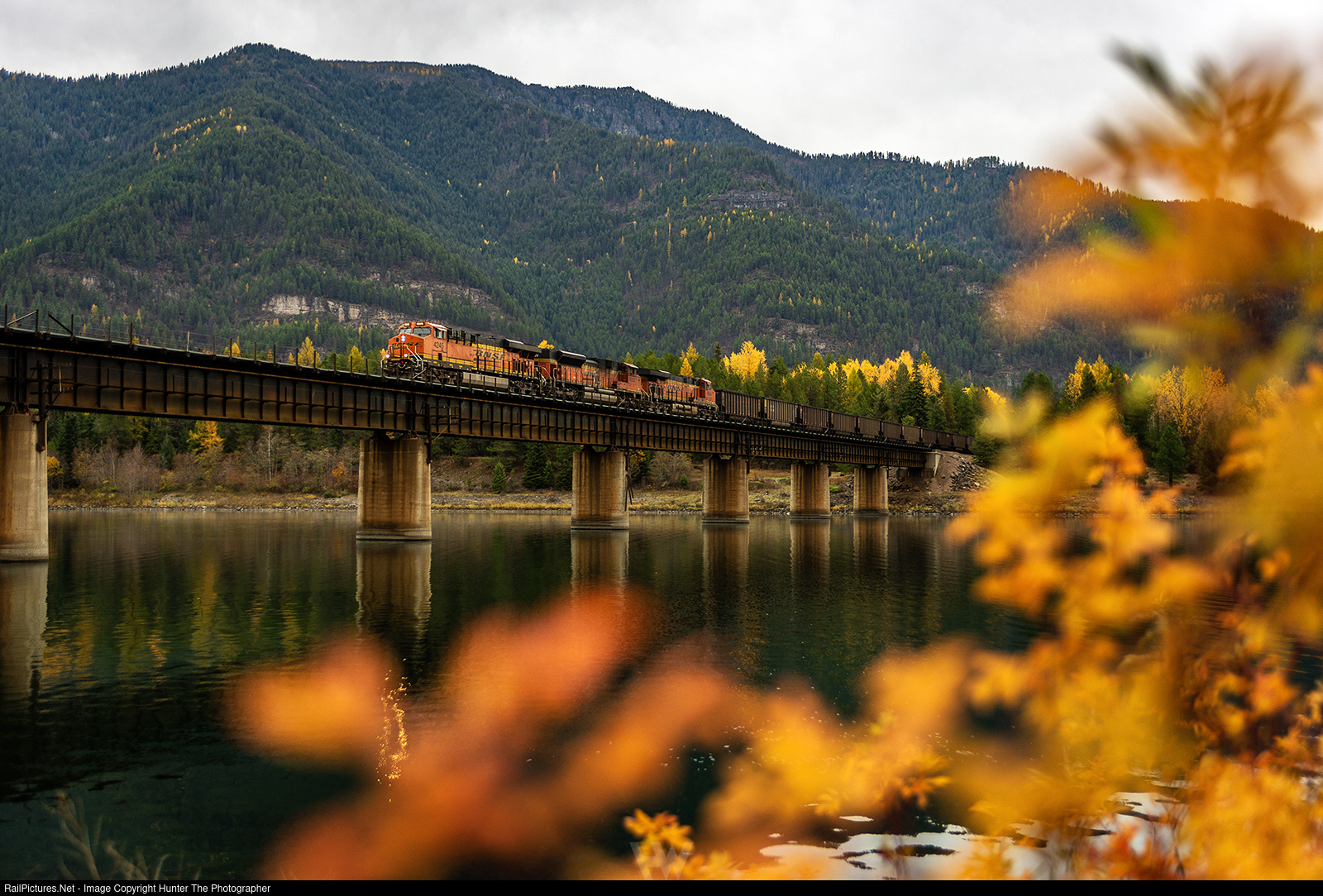 Gold In Them Hills | In front of the 6,344-foot-tall Government Mountain, a train loaded with coal from Wyoming's Powder River Basin crosses the Cabinet Gorge Reservoir near Noxon, MT on an overcast Monday, November 3, 2025 morning. Fall colors are still vibrant in the area, spotting the hills with orange and yellow.