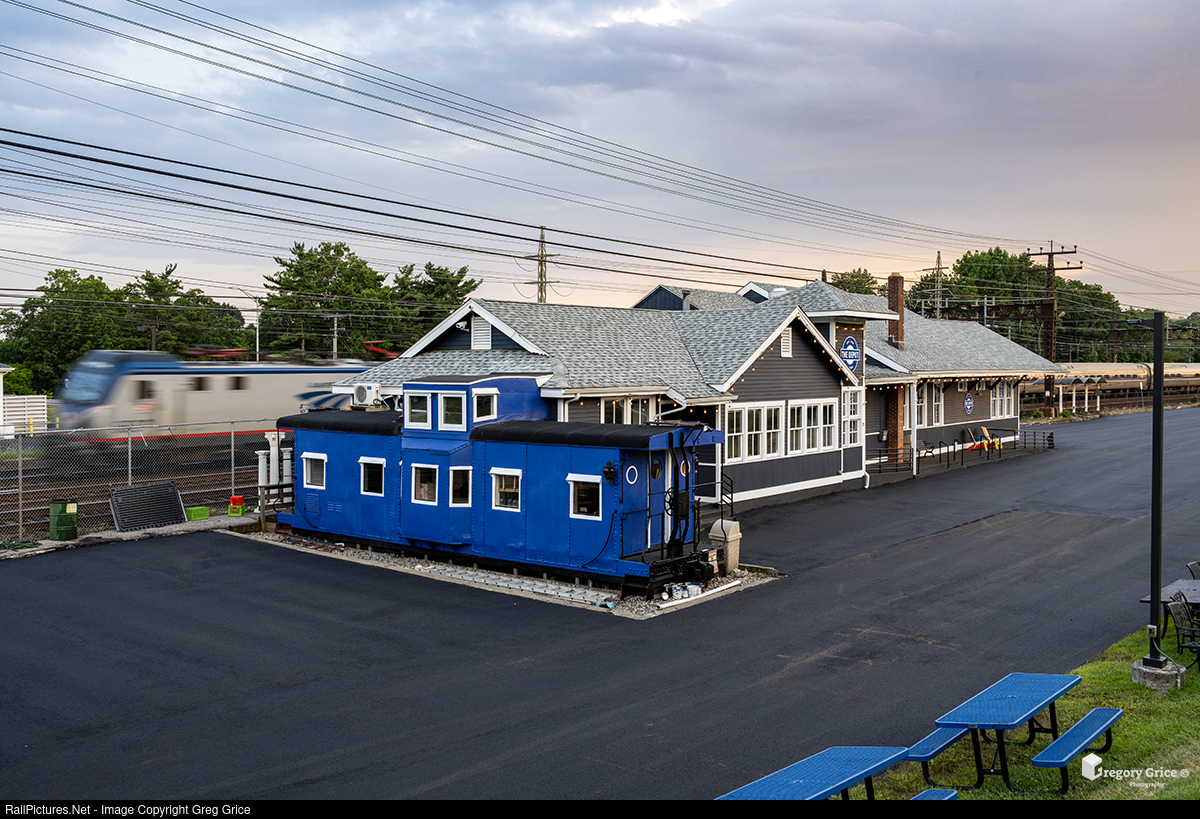 As the sun sets on August 16th, 2025, a fresh coat of blue paint dries on the caboose at The Depot Darien Youth Center as an eastbound Amtrak Northeast Regional passes behind on the New Haven Line in the Noroton Heights neighborhood of Darien, Connecticut. Once green, then red following The Depot’s 2013 makeover, the caboose was painted blue on this day to match the organization’s and building’s colors. The Depot, housed in the preserved former Noroton Heights station, has served as Darien’s youth center for more than 30 years, offering middle and high school students a welcoming and social environment to connect, grow, and give back.