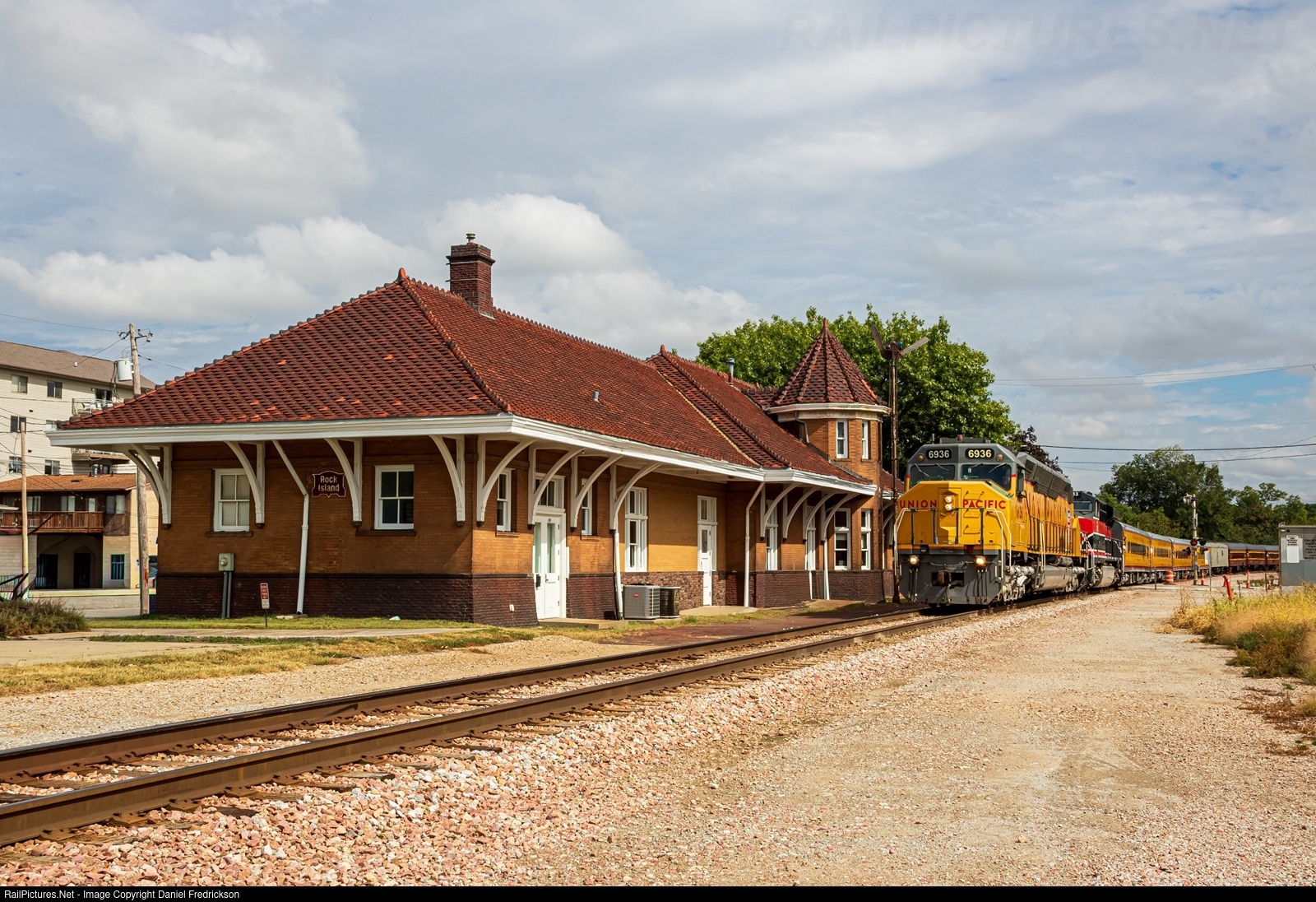 The Railroading Heritage of Midwest America organization operated two days of excursions with restored DDA40X "Centennial" locomotive #6936, with Iowa Interstate providing ES44AC #513 for backup. The trainset operated one round trip per day - west towards South Amana, IA on 9/20 and east to Bureau Junction, IL on 9/21, both trips originating in Silvis, IL. Here, the South Amana trip passes the former Rock Island depot in Iowa City as it makes its way toward South Amana for the wye move to head back to Silvis.