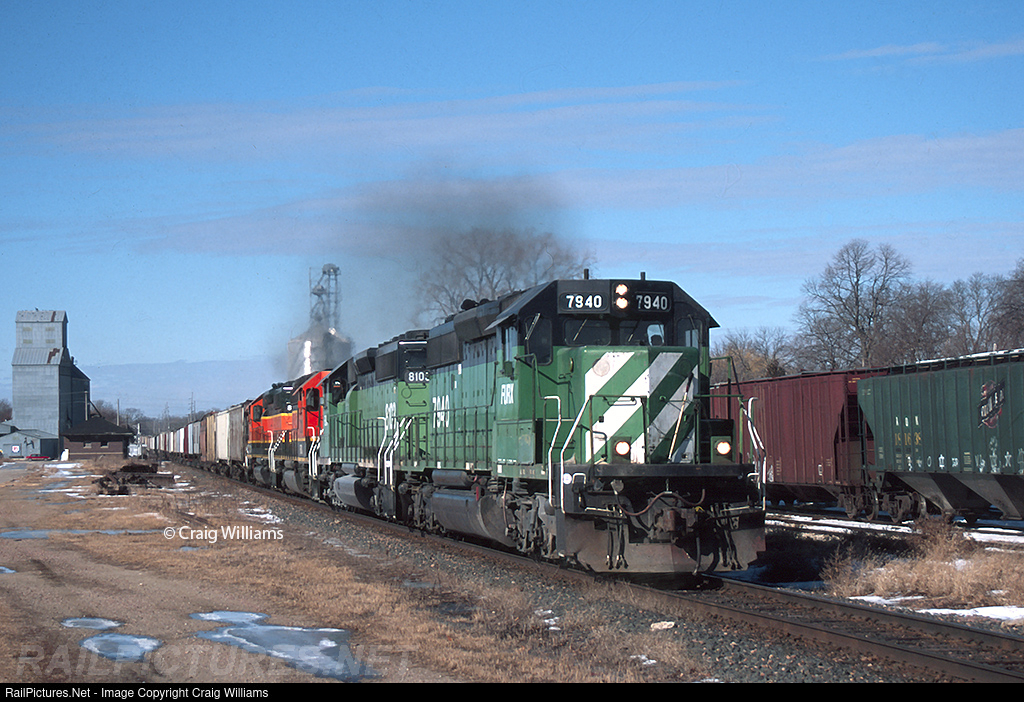 For the start of the IC&E, FURX ex-BN SD40s were leased. 62 of them came to the property in their old BN/BNSF paint. They stuck around for about a year until the IC&E 6400s came on the property starting in April 2003. Here a 4-pack begins accelerating as the grain train begins to climb out of Charles City on the IC&E Mason City Sub. Scanned slide from March 2003.