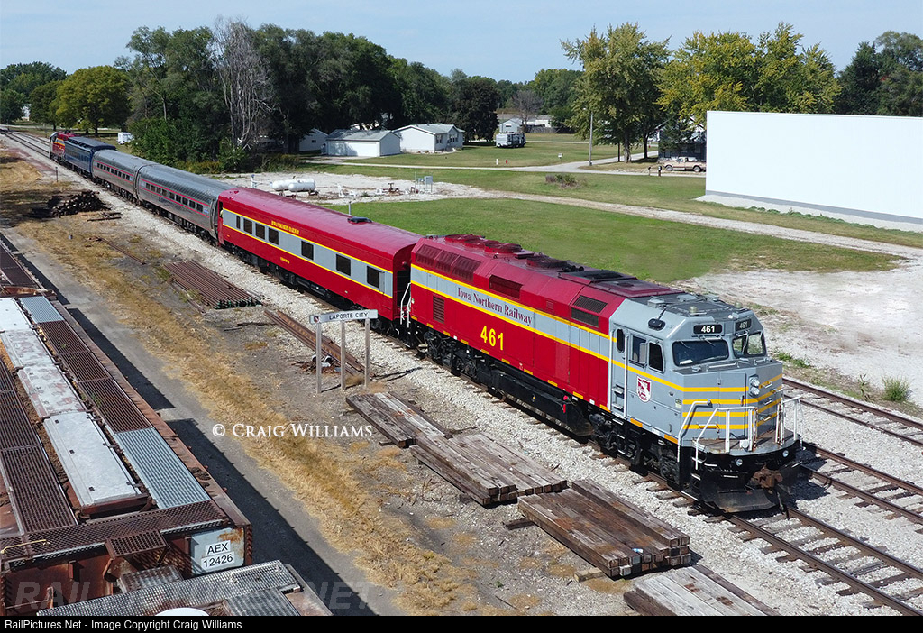 | The Iowa Northern shut down operations for a bit on Saturday so their employees could enjoy a company ride and lunch. The employee special ran from Waterloo to Vinton and back. Here the job pokes along through La Porte City on the way back to Waterloo. The 461 looks nice and shiny bringing up the rear end. The train ran with 2 IANR cars along with 2 Amtrak cars, which I believe are leased right now. |