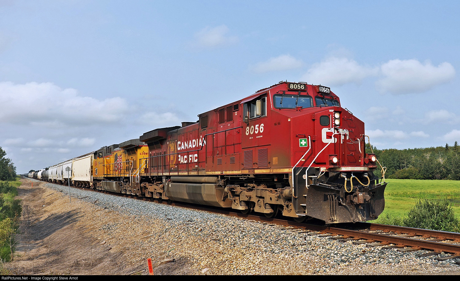 CP AC440CWM 8056 and UP C44AC 6304 lead CPKC B82 east on the Scotford Sub.