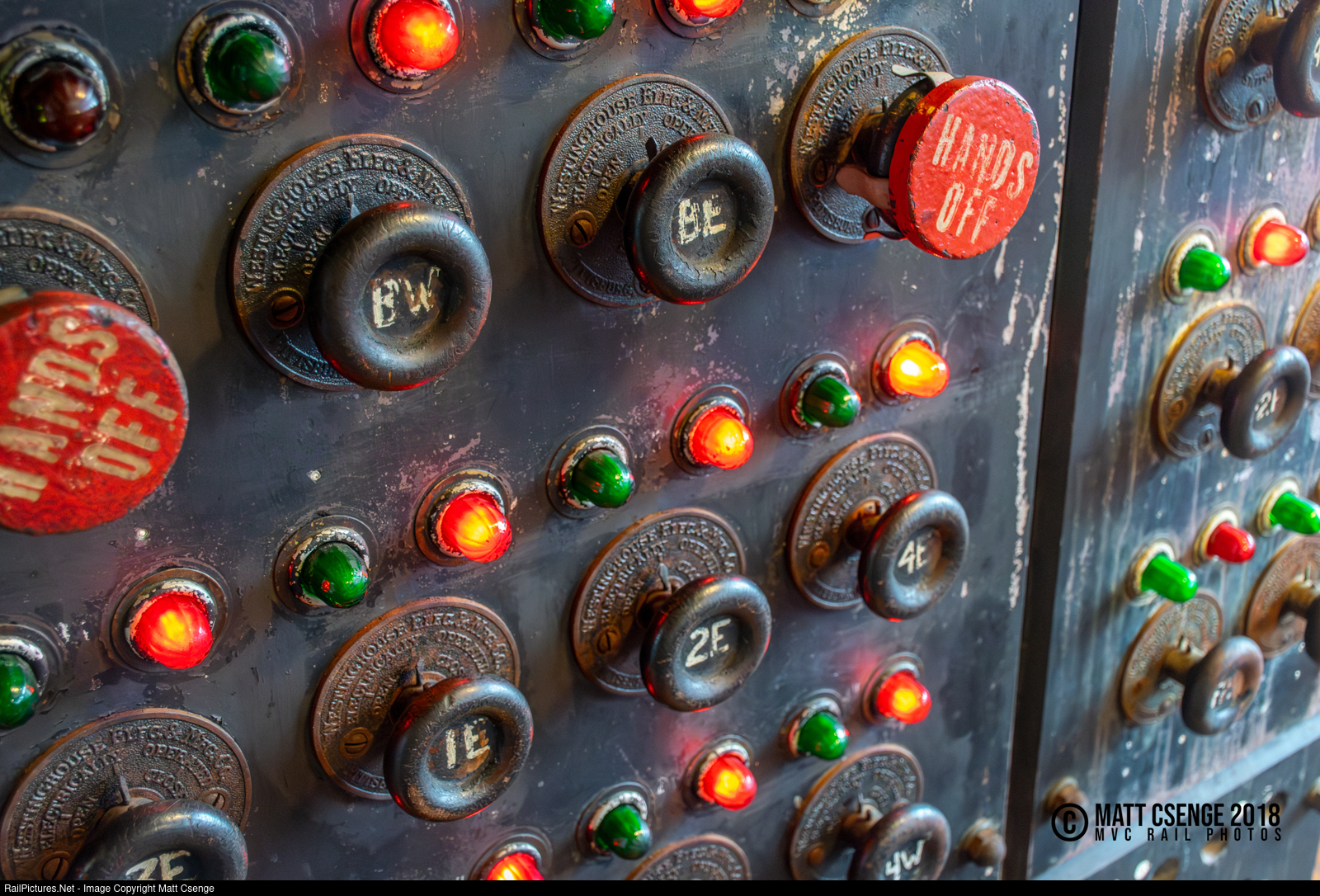 The wall of circuit breakers at the SONO Switch Tower Museum which once monitored the status of the overhead catenary along this section of the New Haven Railroad. Somewhat counterintuitively, the red light meant things were OK and green meant the breaker had been tripped - the logic was that red meant the wire was live and green meant it was safe to work on. |