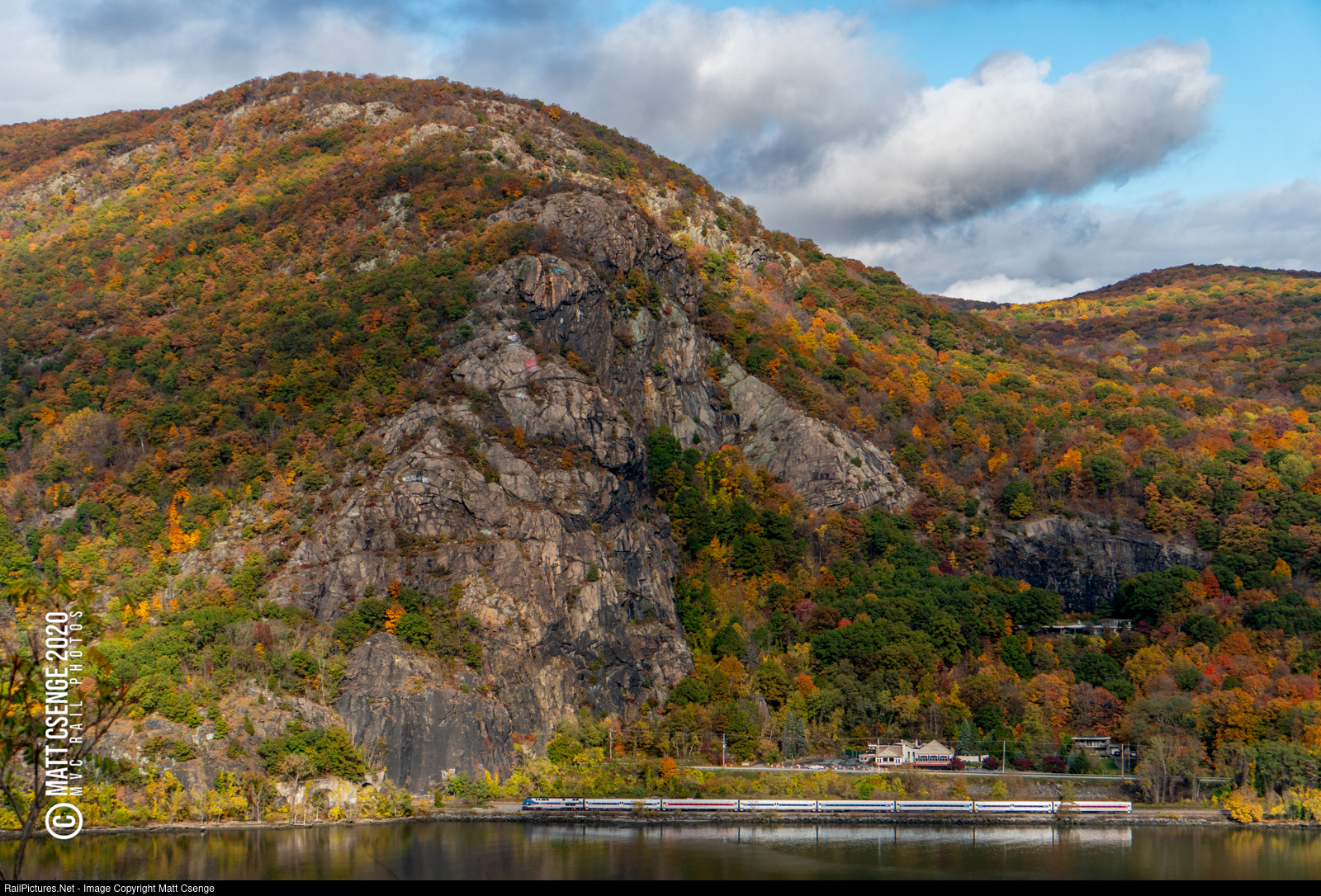 An inbound Hudson Line train races south from the tunnel through Breakneck Ridge, as seen from the overlook on Storm King Mountain on the other side of the river. Metro-North Railroad P32AC-DM no. 227 is on the north end, shoving hard towards Manhattan. |