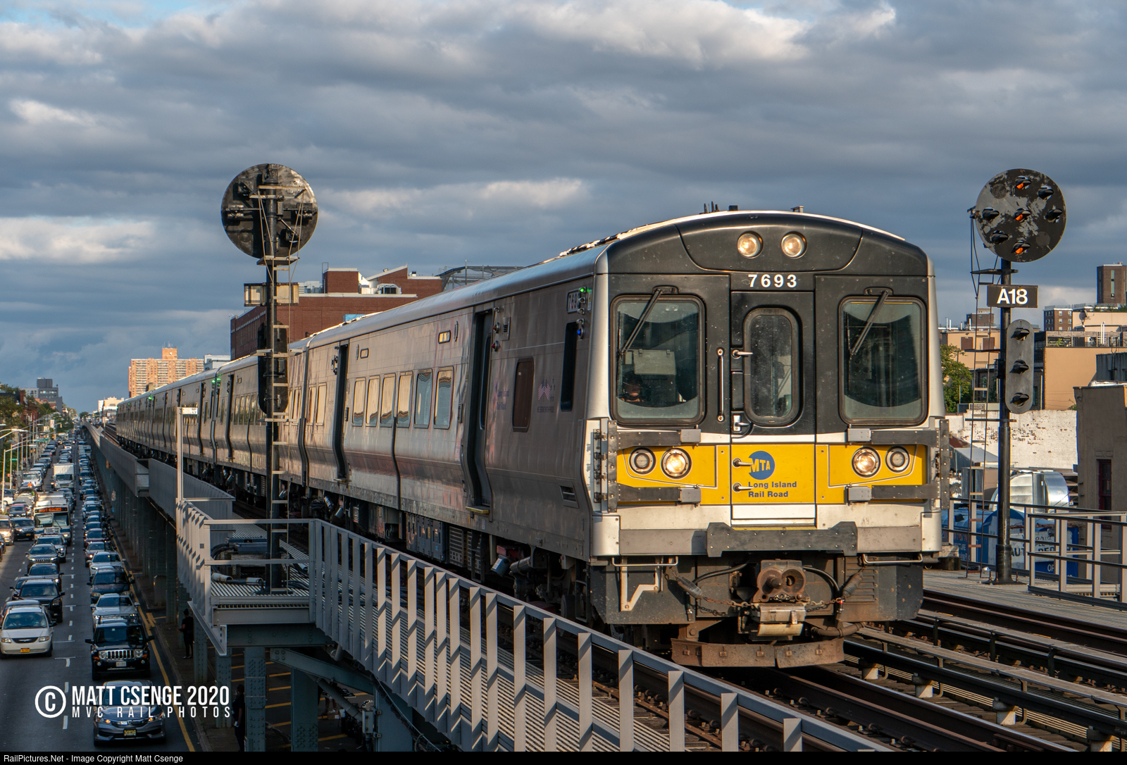 Long Island Rail Road (LIRR) M7 car 7693 is the lead unit on an Atlantic Terminal-bound train seen passing signal A18 as it arrives at Nostrand Avenue Station.