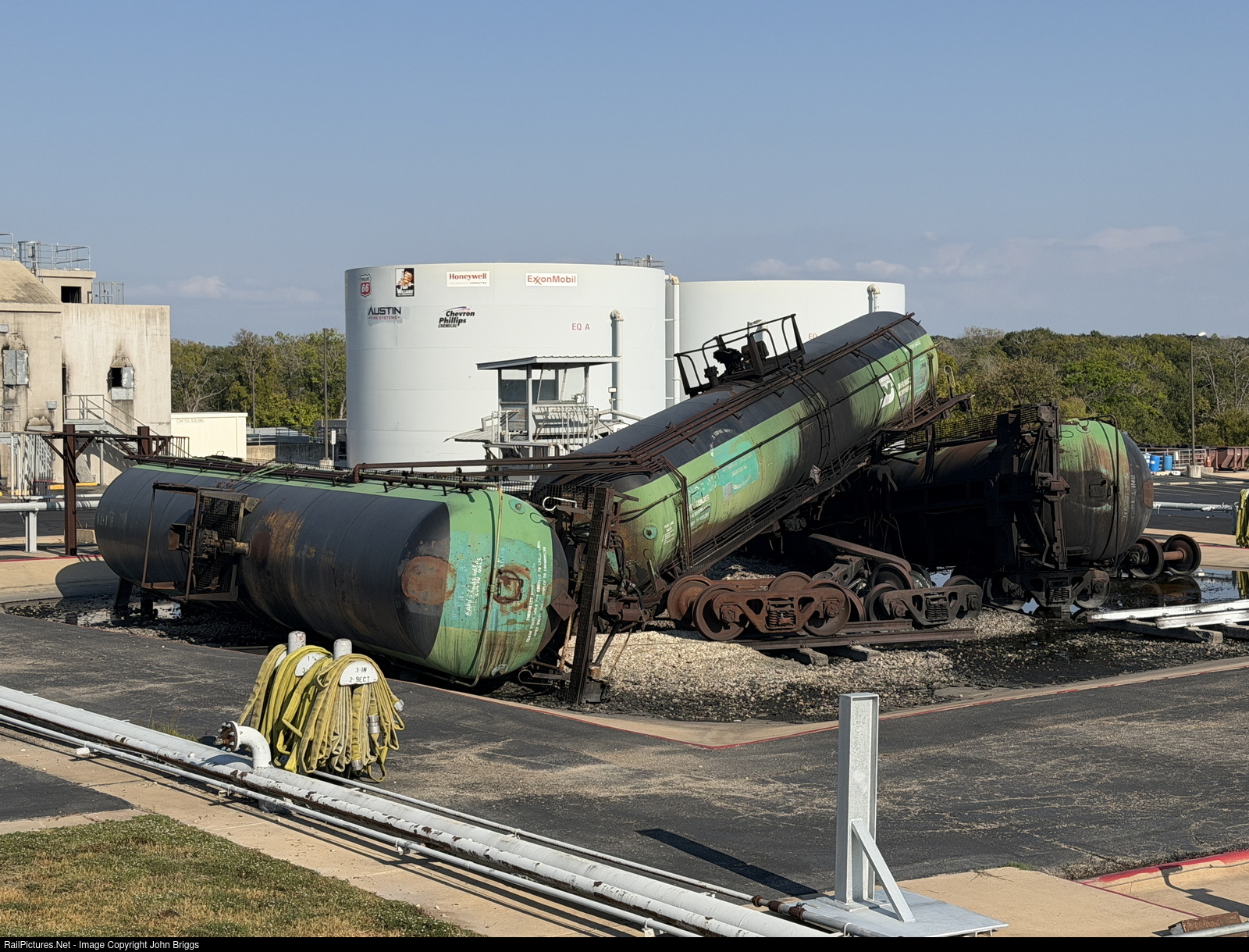 Three former BN / BNSF fuel tenders now serve a new purpose as pieces in a giant diorama at the Texas Disaster City training facility at the TEEX Brayton Fire Training Field. This facility spans 297 acres and features 132 training scenarios designed for first responders. These cars are possibly BNSF 933513, 933514, and 933508, which were photographed in Bryan, TX, in 2014 by Philip Goldstein. The paint on the cars is now fading, making the numbers difficult to read, but the car on the right has a former number, BNFT 14, showing through the paint.