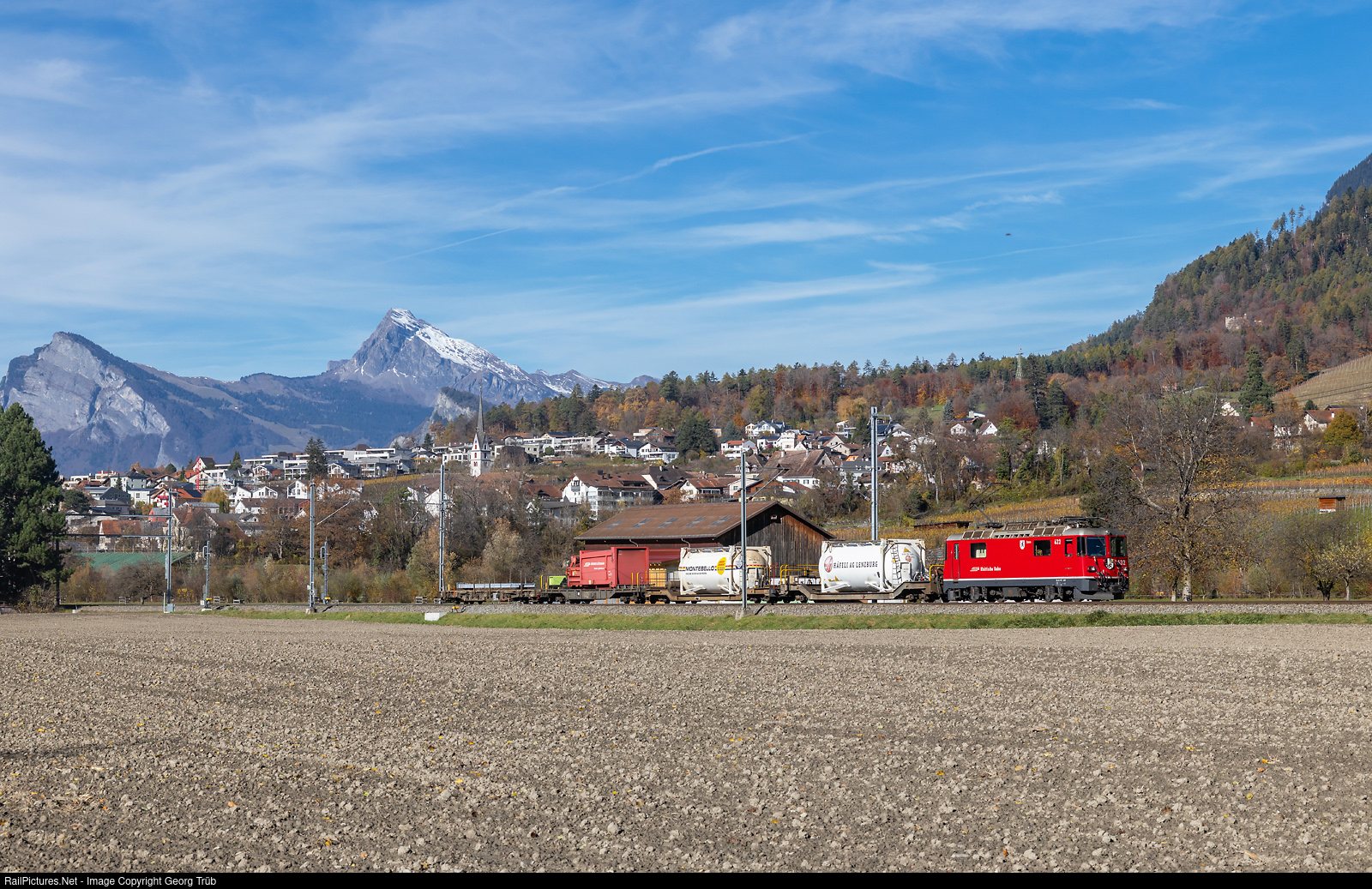 | The Albula line will be closed from November 3 to 17 due to construction work between Thusis and Preda. Freight trains between Landquart/Chur and the Engadin will therefore run via the Vereina line. Ge 4/4 II # 632 pulls the freigh train 6335 from Chur via Landquart-Klosters-Zernez to Samedan, between Malans and Seewis-Valzeina, with Gonzen and Gauschla mountains in the background. |